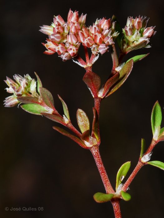 Blütenstand dicht, Zweige des Blütenstandes sehr kurz, Blüten ca. 1 mm lang gestielt, Hüllblätter häutig, deutlich sichtbar, Kronblätter weiß, stumpf oder schwach gezähnt, , kürzer als die Kelchblätter, mit 3 Staubblättern Kelchblätter kapuzenartig, nicht gekielt Samen weißlich, glatt Blätter