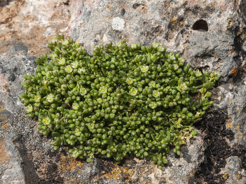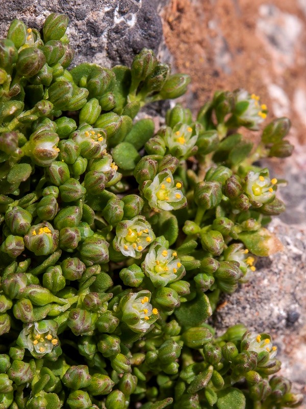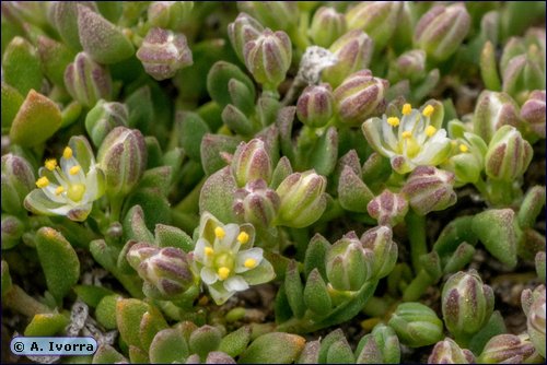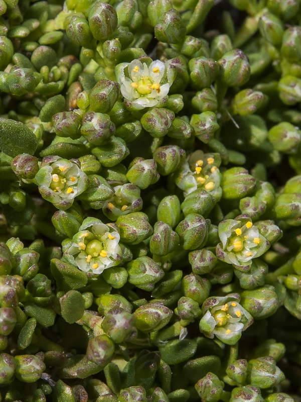 Kronblätter weiß, gestutzt oder ausgerandet, kürzer als die Kelchblätter Samen weißlich, nur am Rücken höckerig- warzig Blätter nicht fleischig, spatelförmig, am Grund allmählich verschmälert, ohne deutlichen Blattstiel, 8 - 12 mm lang, 3 - 5 mm breit, meist rötlich überlaufen, alle Blätter zu 2, gegenständig