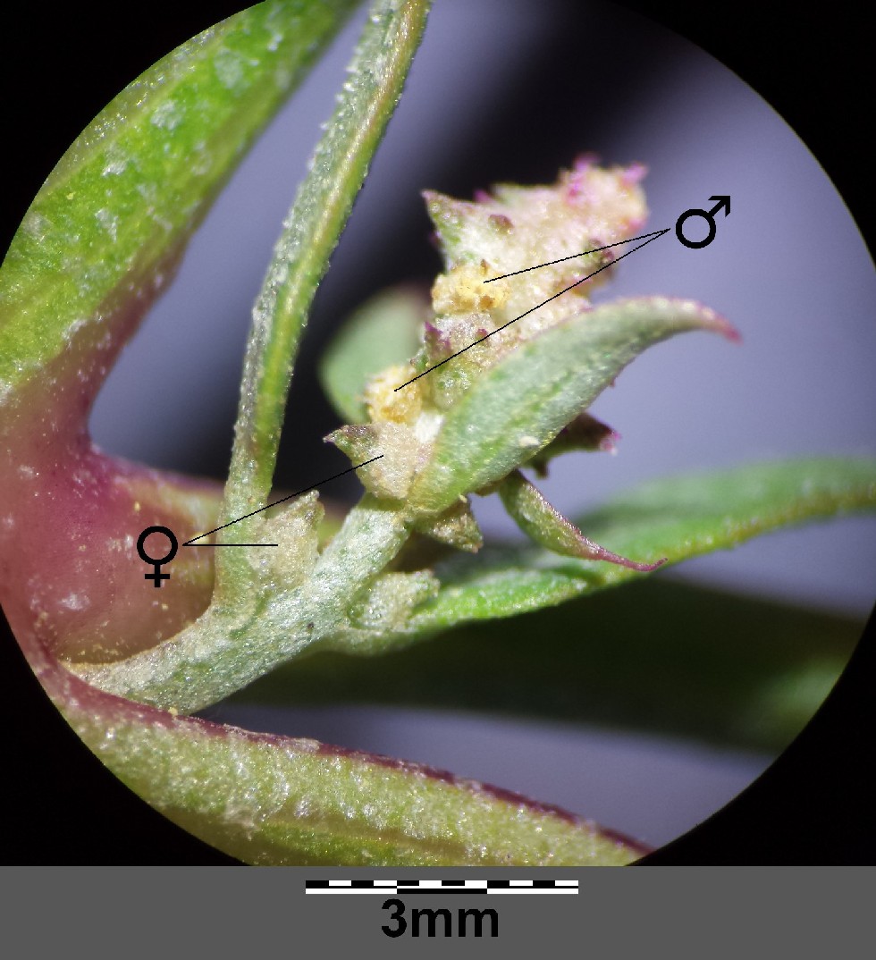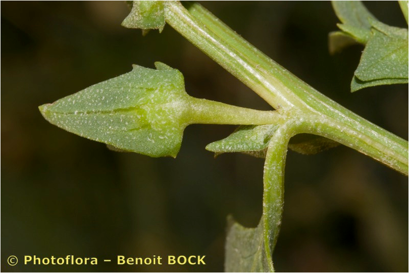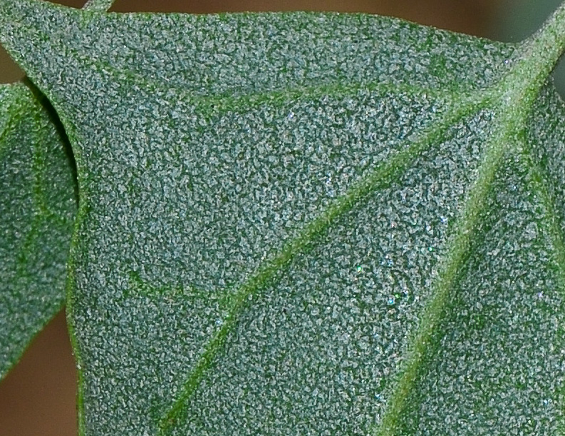Blätter bis 8 cm lang, dreieckig, am Grund gestutzt oder ausgerandet Blattränder ganzrandig oder entfernt gesägt, unterseits schülfrig C3- Pflanze: Nervennetz im Durchlicht undeutlich, locker, unregelmäßig