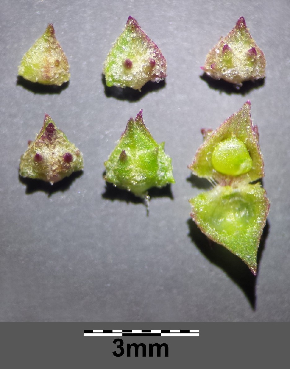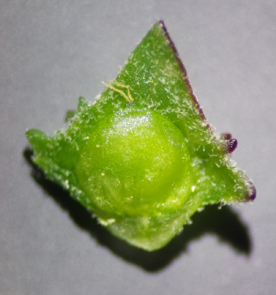 Vorblätter 4 - 10 mm lang, +/- dreieckig, ganzrandig oder mit sehr kleinem Zahn, mit nur einem kräftigen Mittelnerv, auf der Fläche warzig