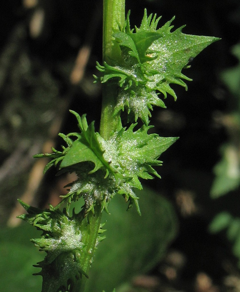 Blätter bis 12 cm lang, dreieckig, wobei alle 3 Seite fast gleich lang sind, seitlich Blattränder grob gesägt