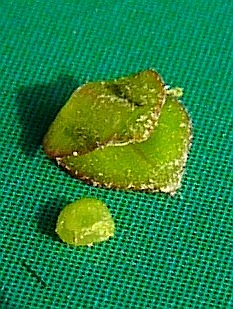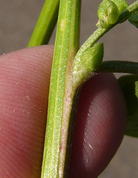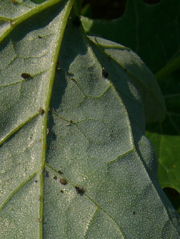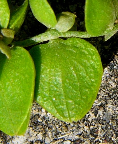 Es gibt nur wenige kleine, keinen mittleren und viele +/- gleich große Vorblätter Vorblätter rundlich, kurz zugespitzt, ganzrandig, bis 1 cm groß, größte Breite unterhalb der Mitte, Adern der Vorblätter hervortretend, netznervig Blätter und Spießecken plan oder nach oben gebogen, Blätter oberseits dunkelgrün, stark glänzend Blattunterseite weiß bemehlt Blätter verfärben sich im Herbst nur gelb