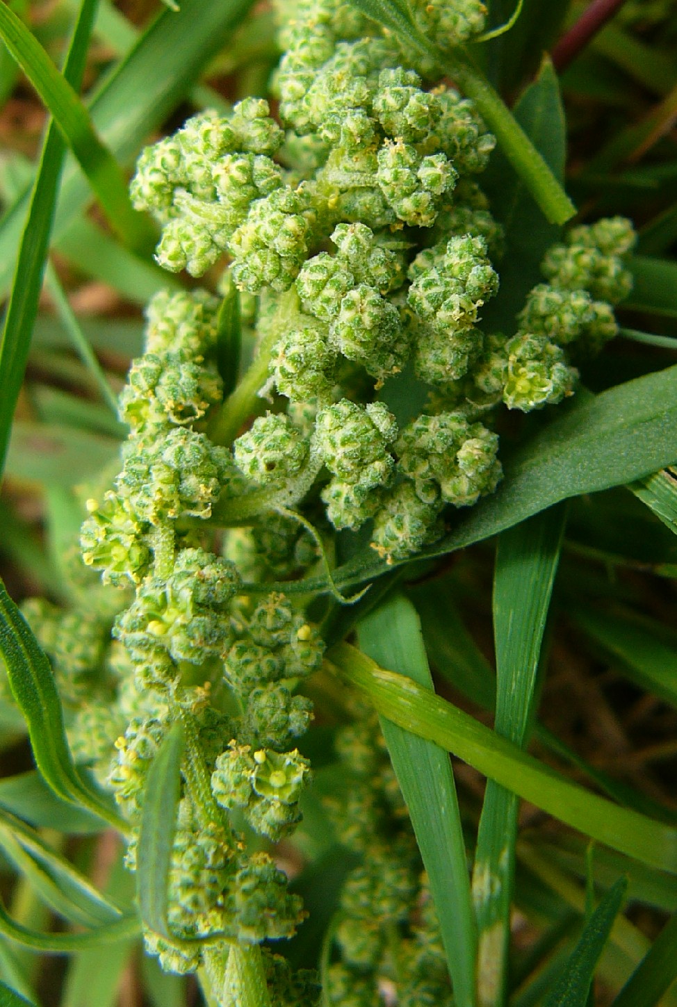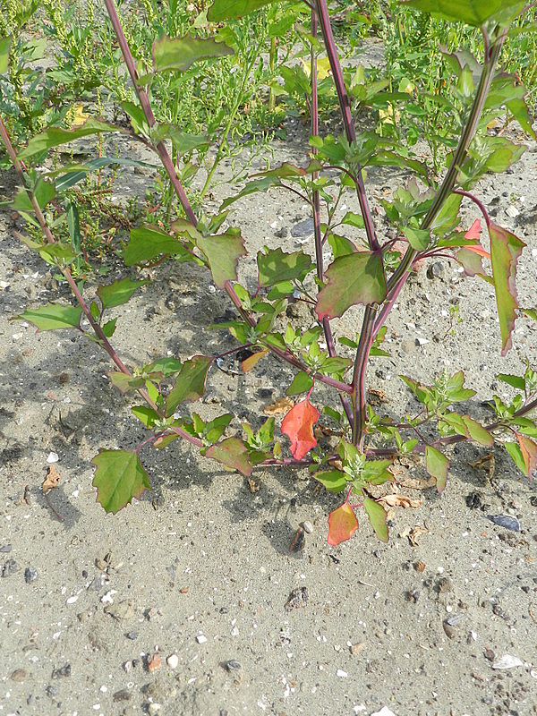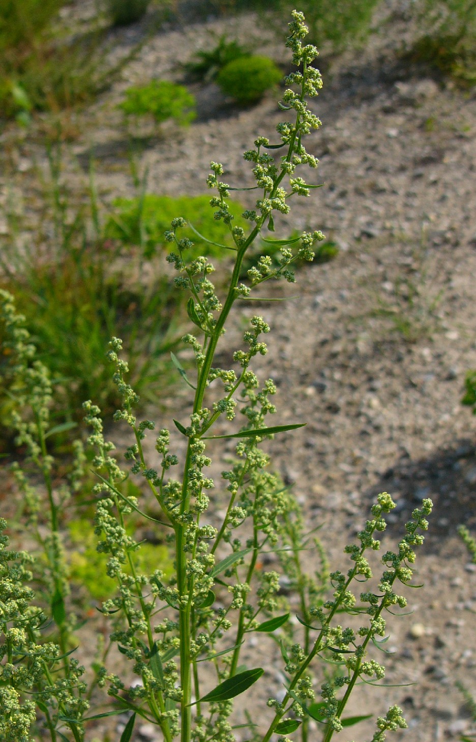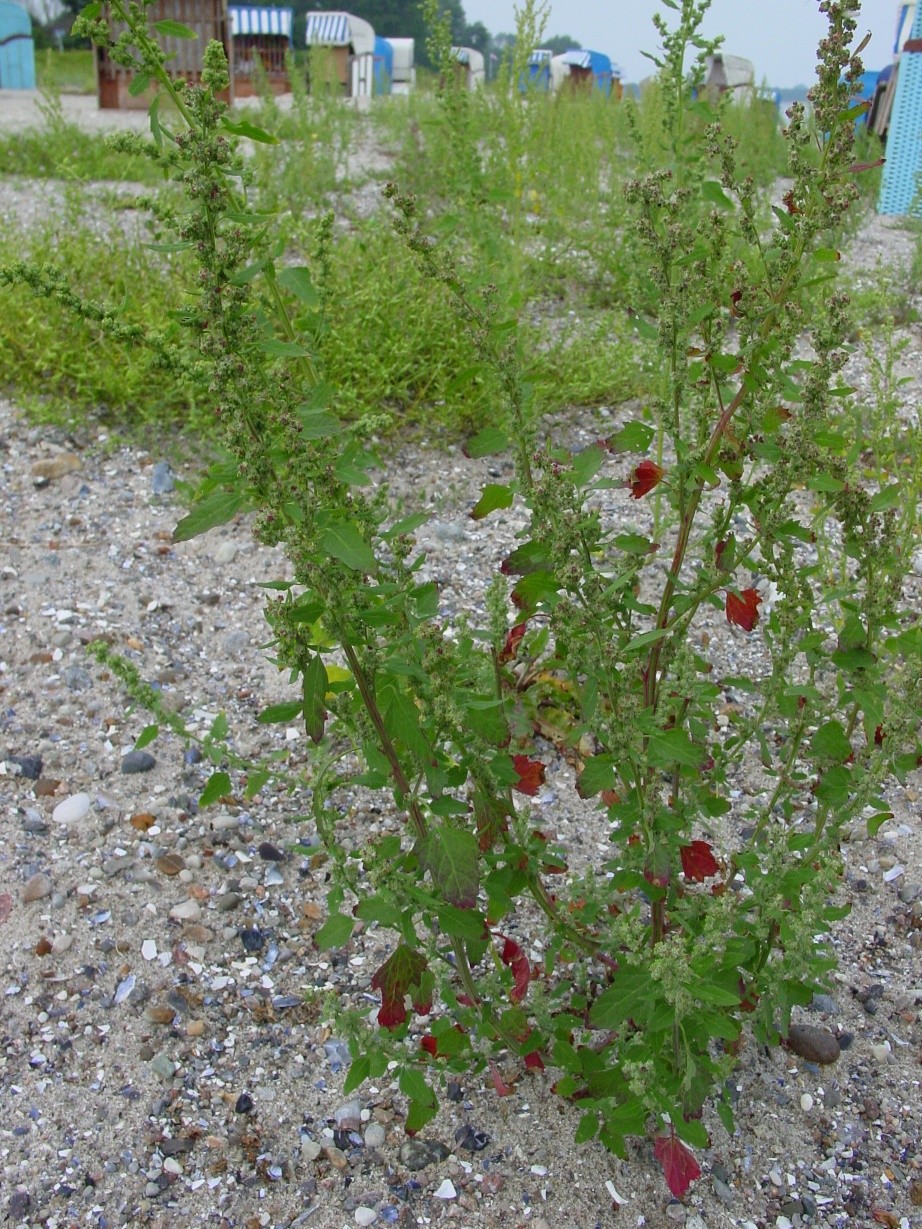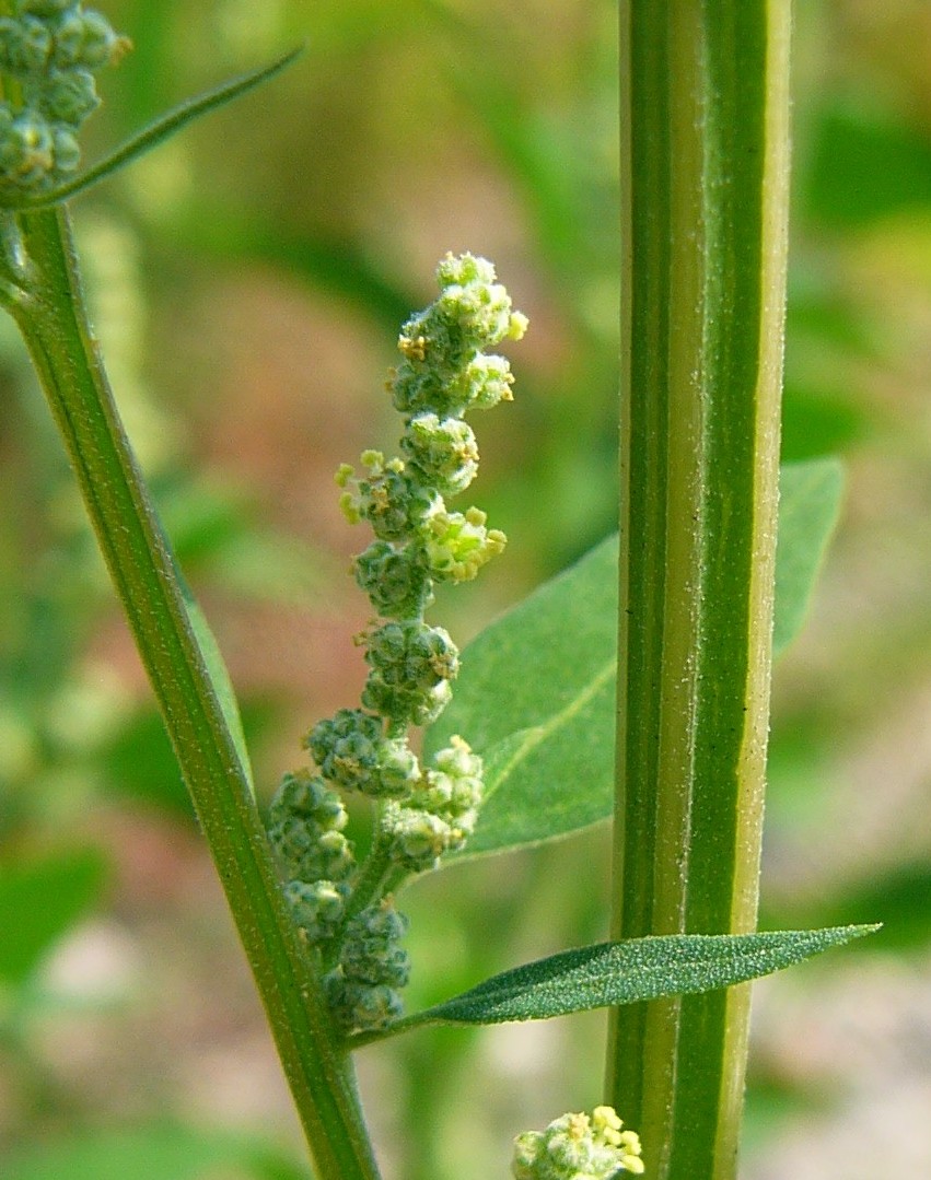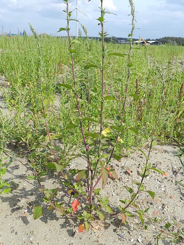 Pflanze 30 - 100 cm groß Blütenstand locker, wenigblütig, am Ende des Blütenstands oft gabelästig, teilweise mit deutlich gestielten Einzelblüten, Perigon und Blütenstiele wenig bemehlt, Reife Frucht im Perigon nicht sichtbar, obere Blätter meist lanzettlich, ganzrandig,