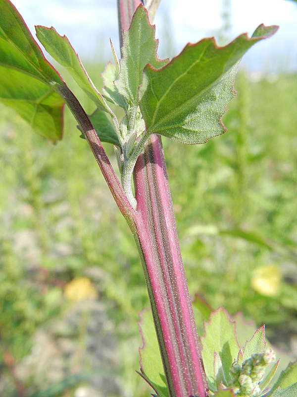 Äste kantig, rillig, oft rot gestreift Blätter rhombisch, unregelmäßig gelappt,