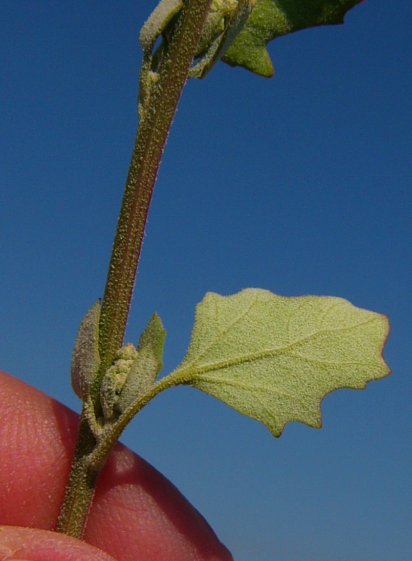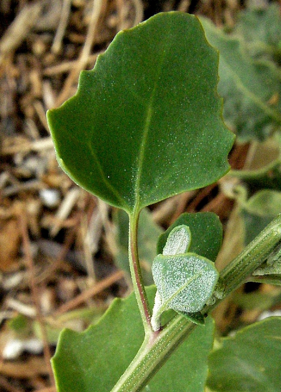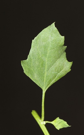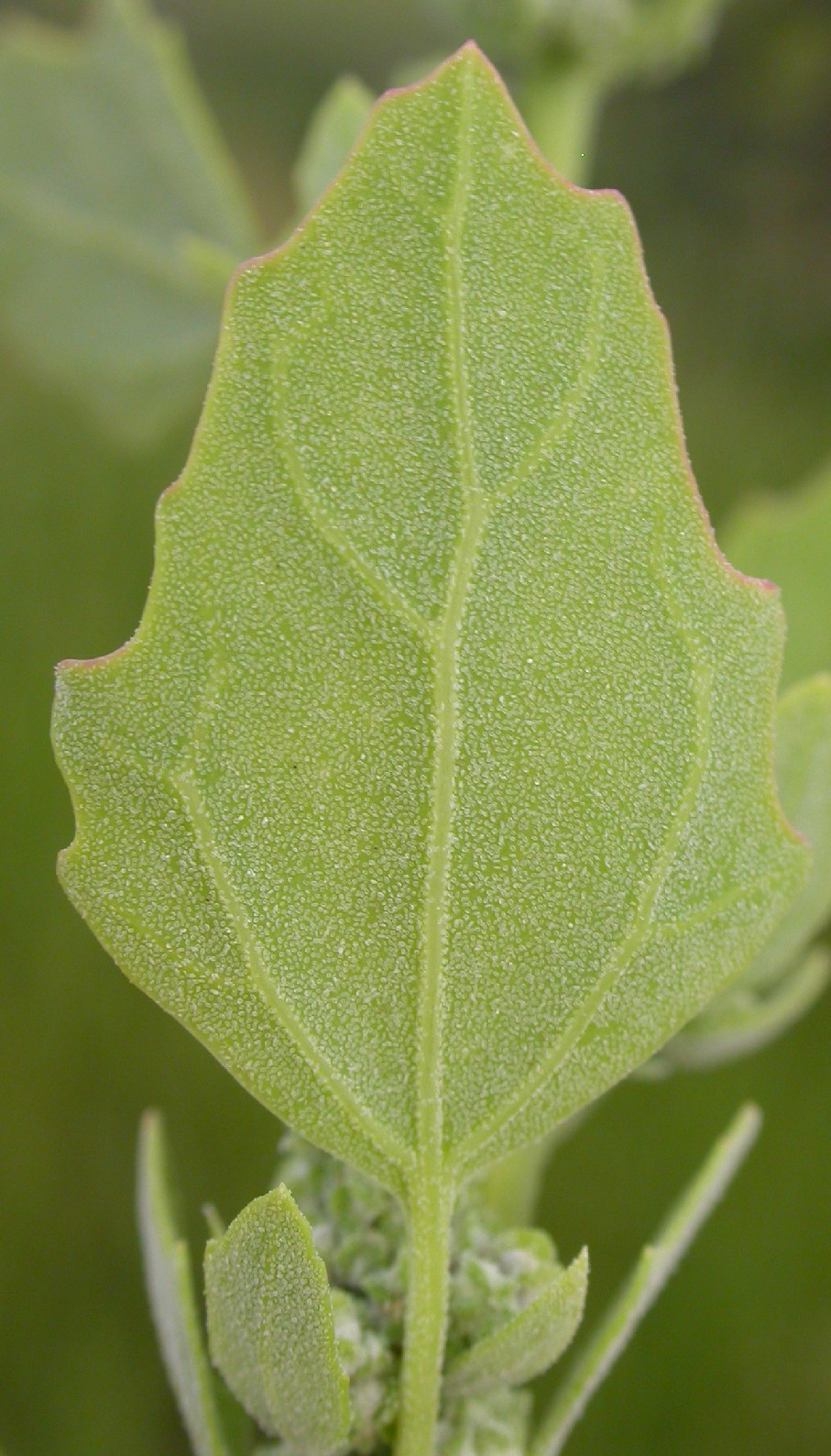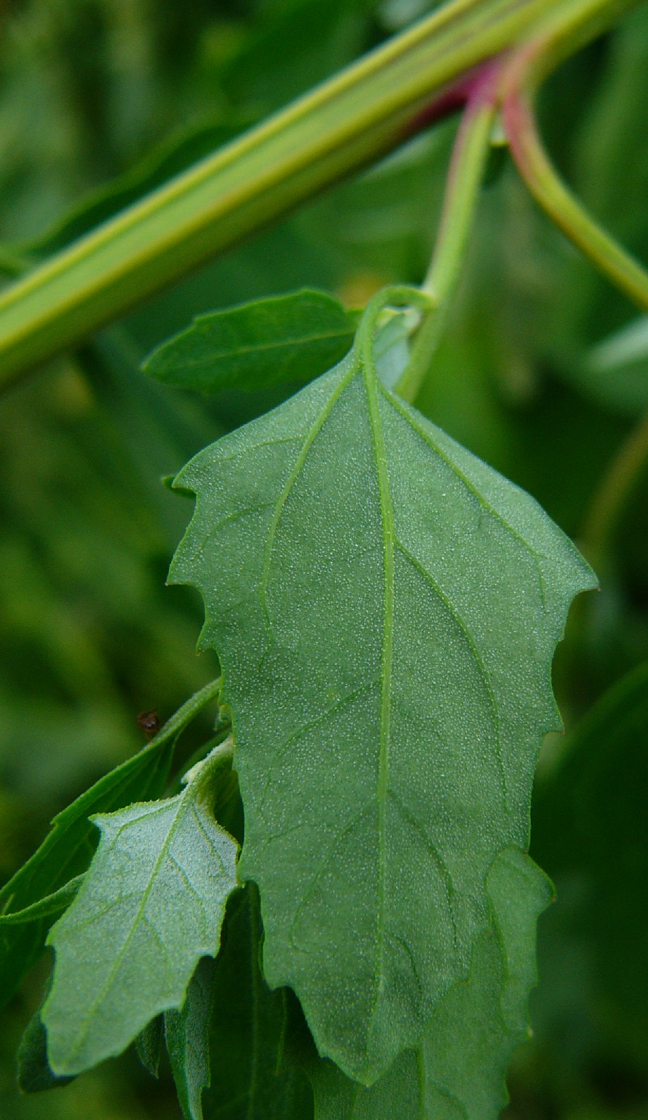 Stängel dünnwandig, im oberen Teil meist leicht zusammendrückbar, nie rötlich überlaufen, Blätter dünn, zart, etwas transparent, rhombisch, an der Basis oft lappig verbreitert die scharfen Blattzähne meist nach vorne gebogen, Blattober- und unterseite wenig bemehlt