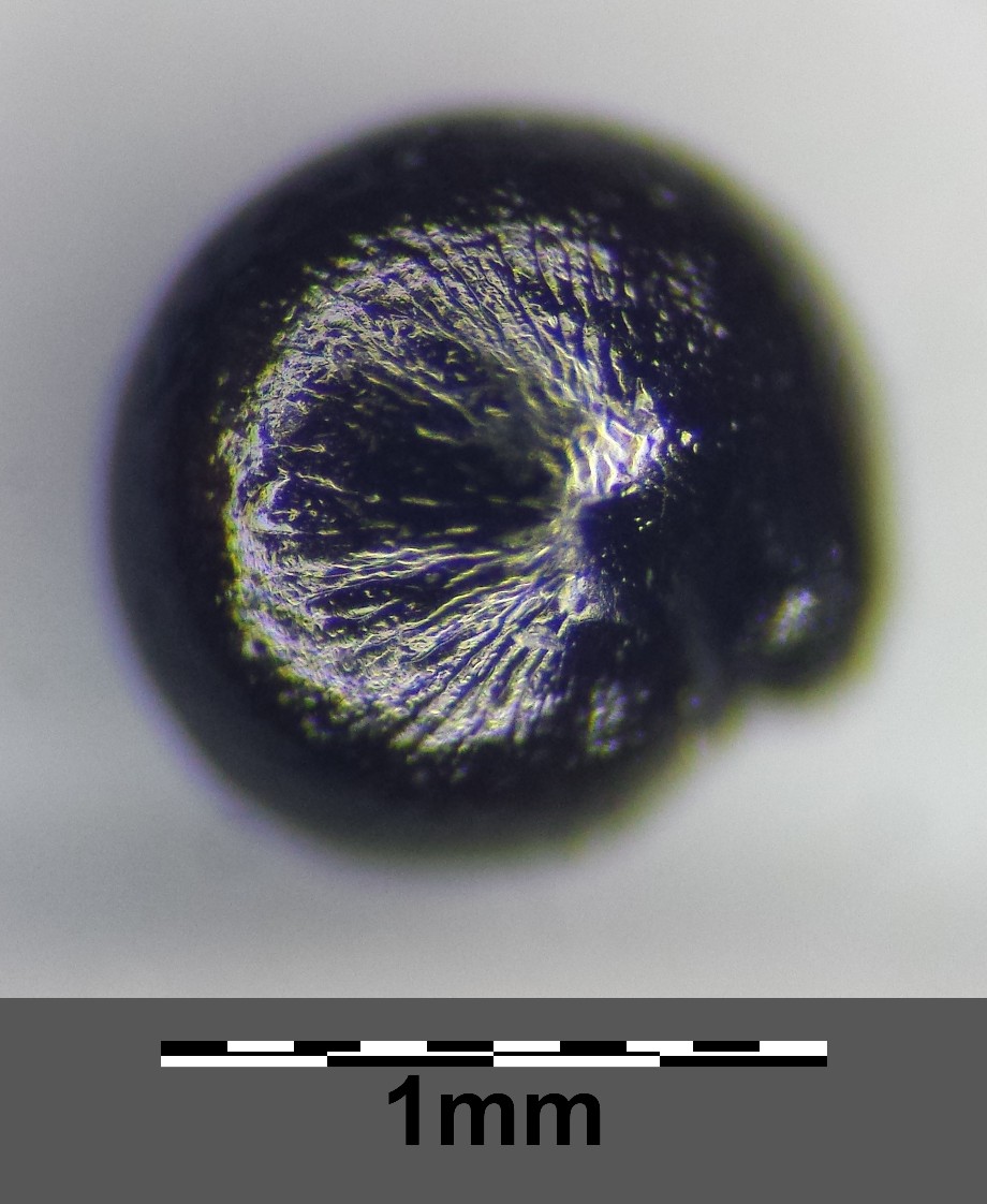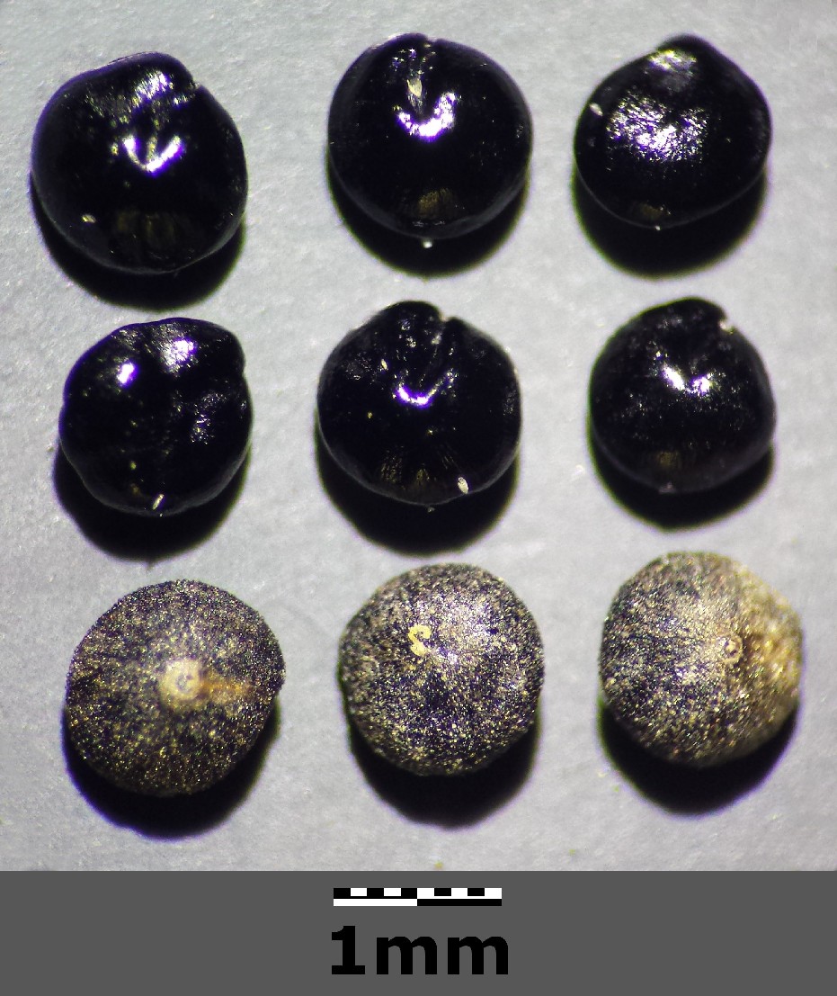 Samen 1,3 - 1,8 mm im Durchmesser, am Rand abgerundet, auf den Flächen deutlich radiär gerillt, mit narbig-grubigen Netzmuster