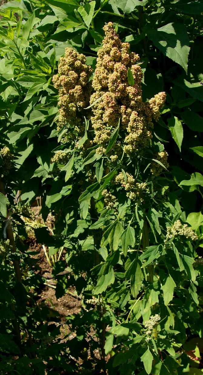 m, Kulturpflanze, Samen weißlich, 2 mm Blüten- und Fruchtstand klumpig zusammengezogen > Chenopodium quinoa |