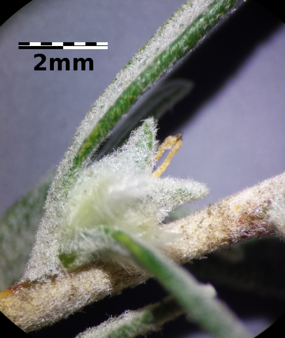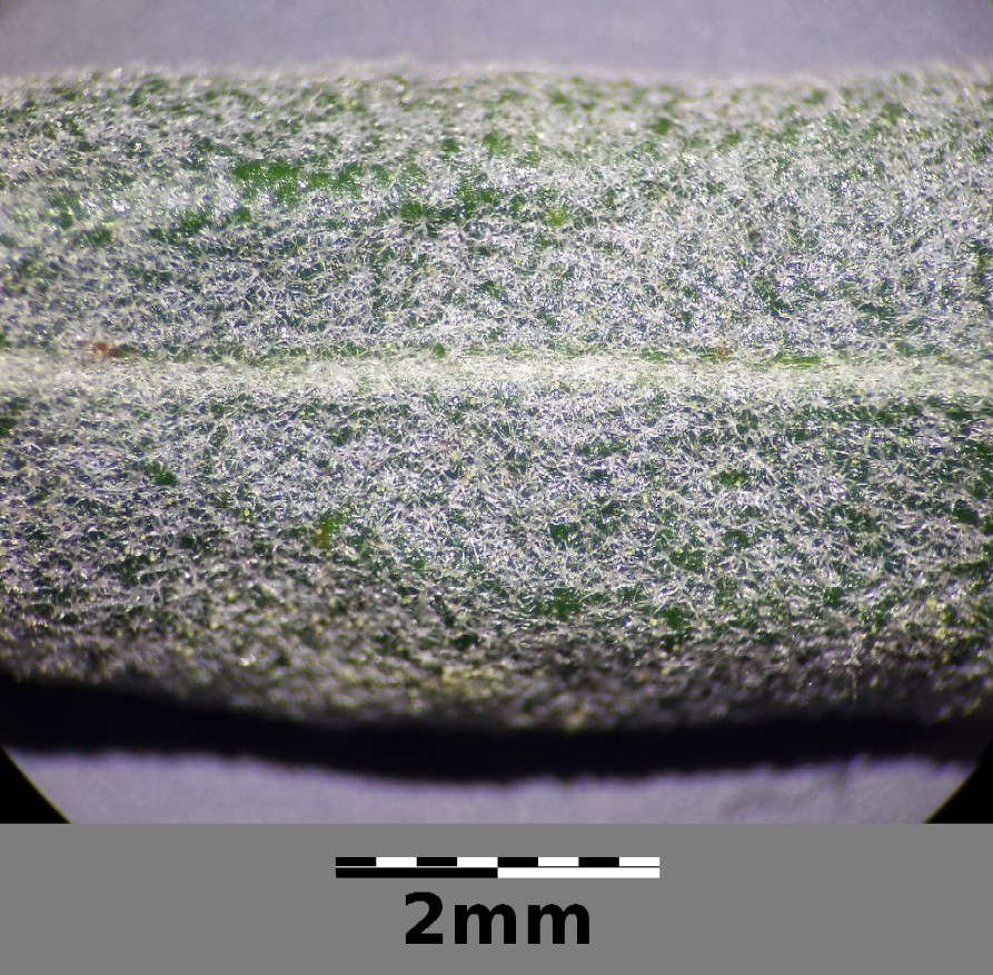 40 mm lang und 4 bis 10 mm breit, ganzrandig, Blätter auf der Oberseite sternhaarig