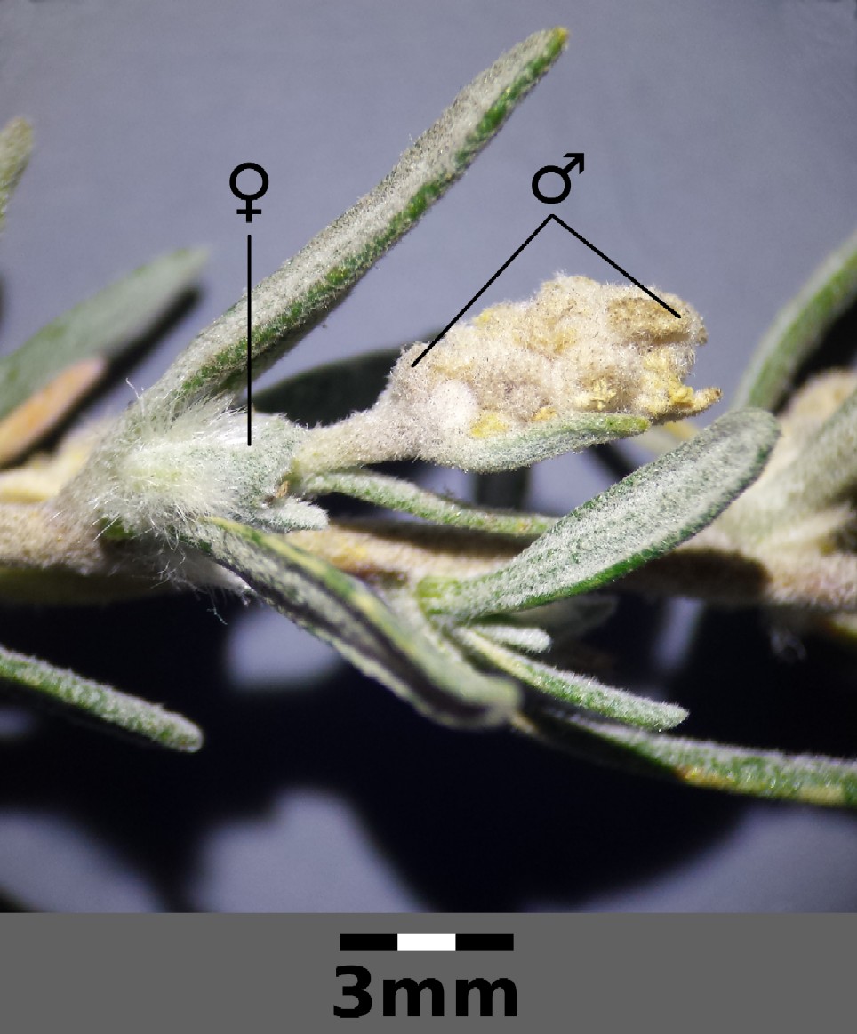 Männlichen Blüten bilden eine dichte, endständige, mehrblütige Scheinähre, die in der Achsel eines 3 - 7 mm langen Tragblattes stehen,