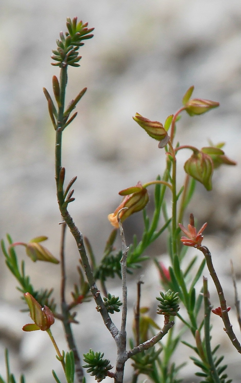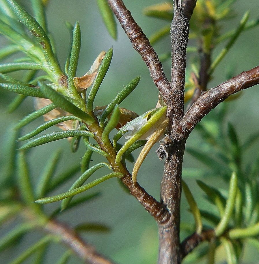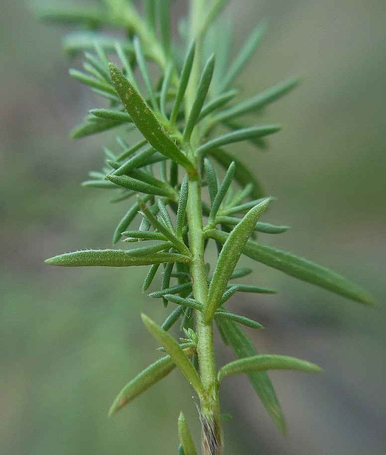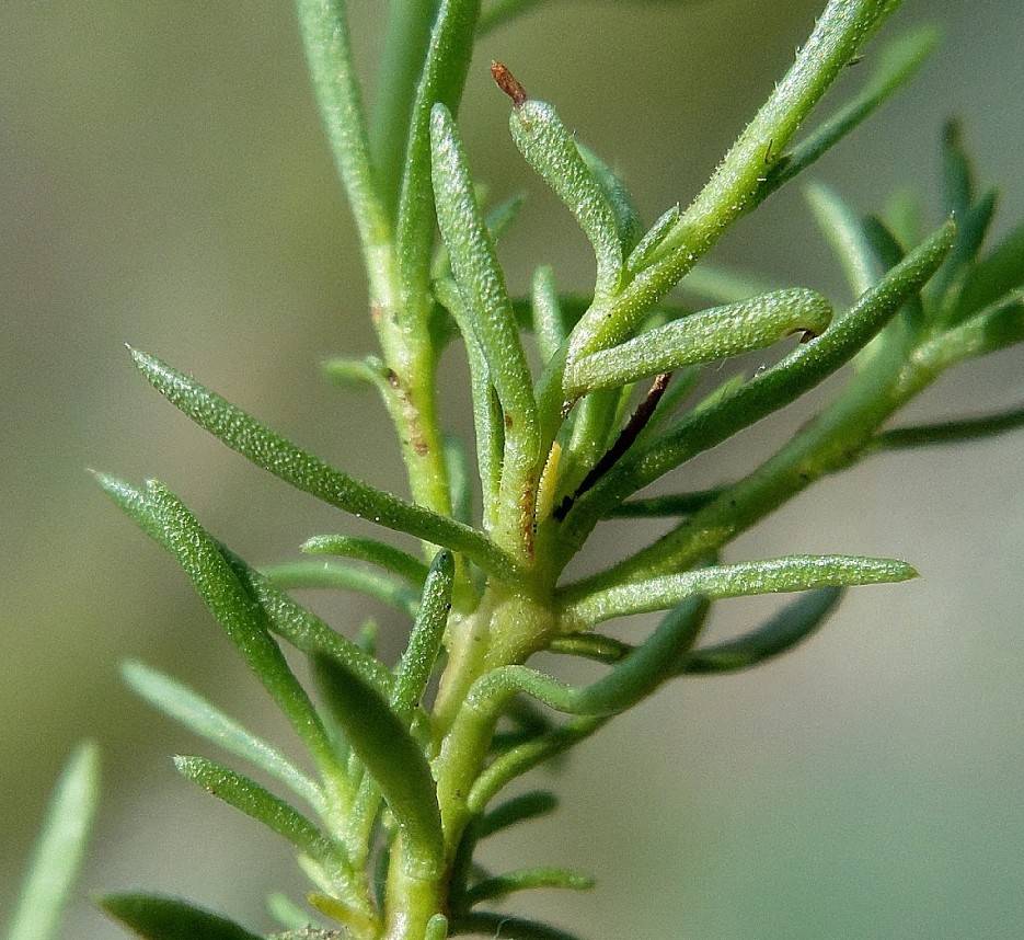 Blätter wechselständig, ohne Nebenblätter, linealisch, 4 - 10 mm lang, 0,5 - 1,5 mm breit, aufrecht abstehend,