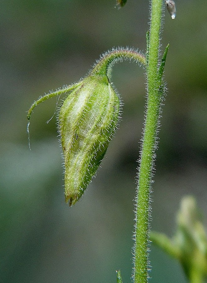 Fruchtstiel 10 - 12 mm lang, zart, abstehend, +/- zurückgebogen, drüsig, viel länger als die umgebenden Blätter, nach dem Abfallen der Frucht bleibend Kapsel bleibt auch während des Ausstreuens der Samen mit dem Kelch verbunden, Klappen sind dann weit geöffnet und abstehend, entält meist 9 Samen