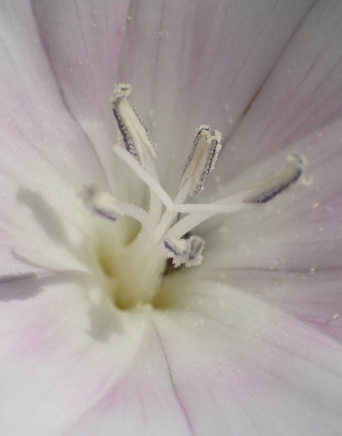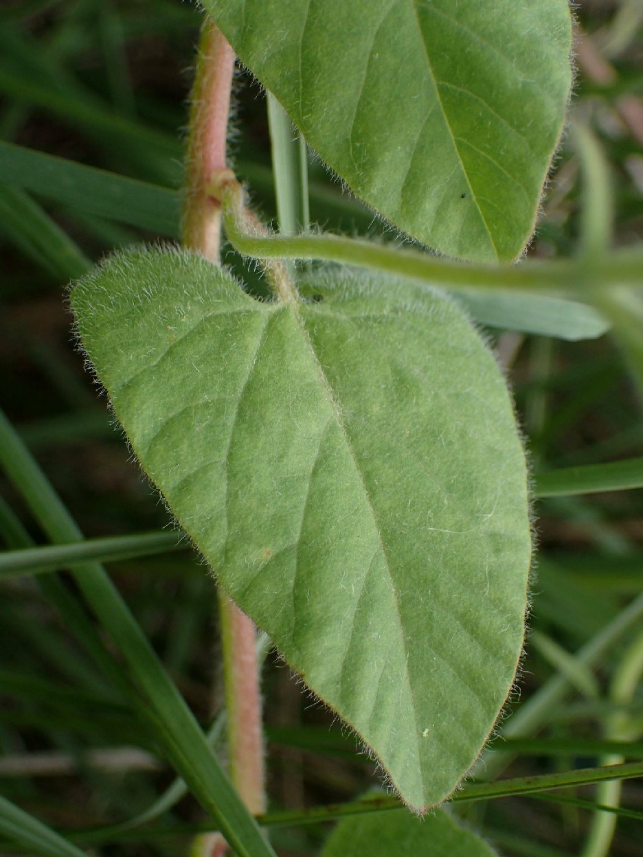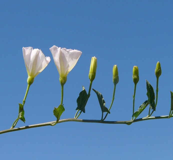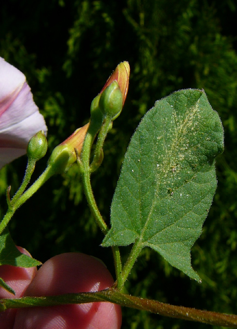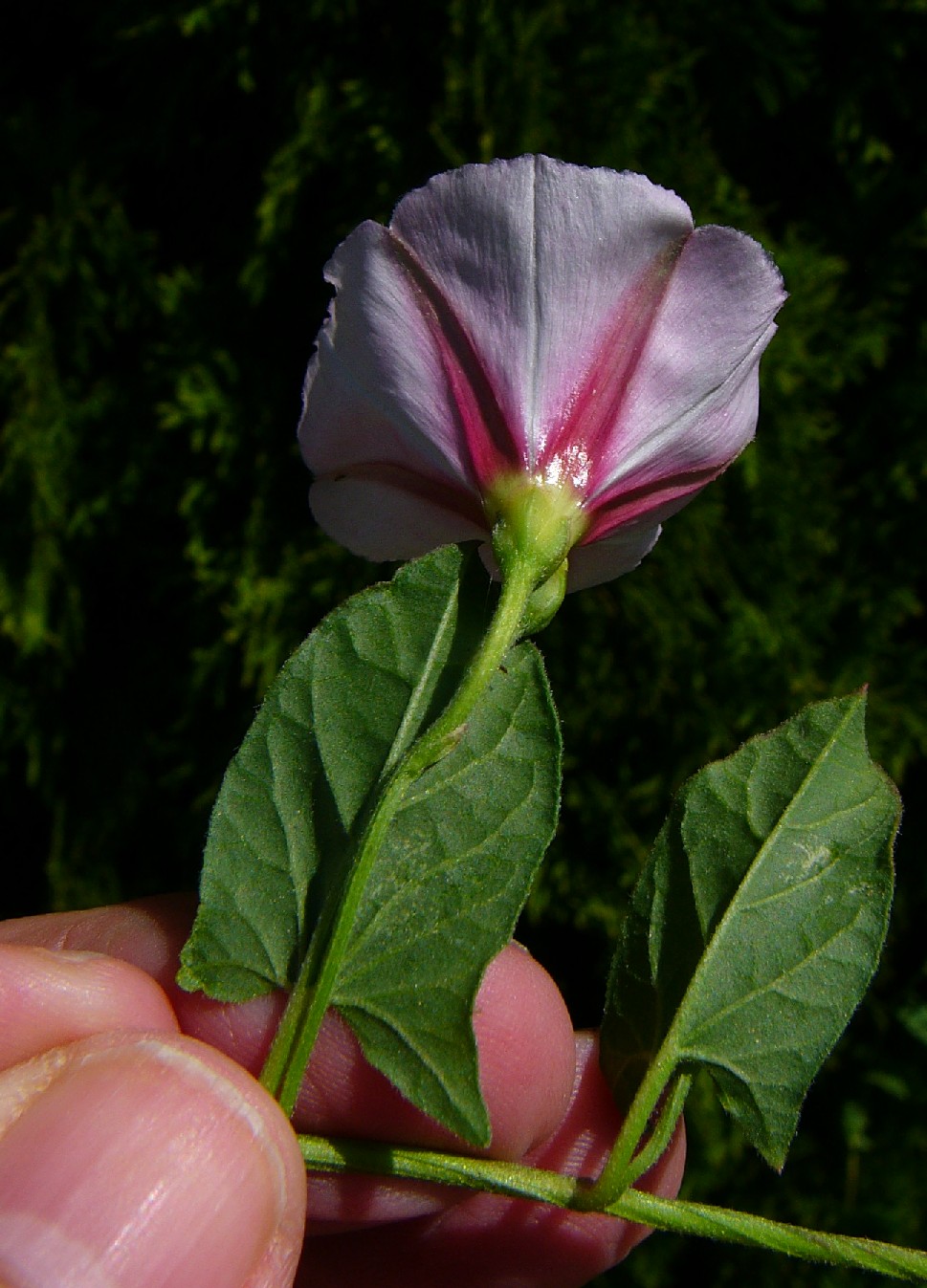 Schlund gelbgrün Staubblätter am Grund verwachsen, Staubbeutel cremefarben, pfeilförmig Griffel mit 2 fädlichen Narbenlappen Blüten außen an den Nahtstellen der zusammengewachsenen Blütenblätter mit andersfarbigen, keilförmig auf dem Blütenrand zulaufenden Streifen, Kelch kahl oder angedrückt behaart, Kelchblätter weniger als 5 mm lang, stumpf oder ausgerandet oft mit Spitzchen, Vorblätter kurz, linealisch, vom Kelch weit entfernt Kapsel kahl, auf geraden Stielen Blätter 1 - 7 cm lang, 1 - 3 cm breit, spießförmig, gestielt, mit zugespitzten Öhrchen, ohne Ranken, kahl oder kurzhaarig Stängel gedreht, Blätter unterseits kahl oder behaart Blattspreite je nach Varietät breit oder schmal