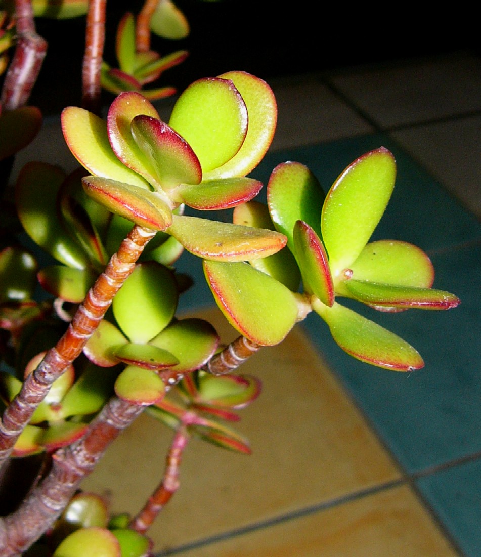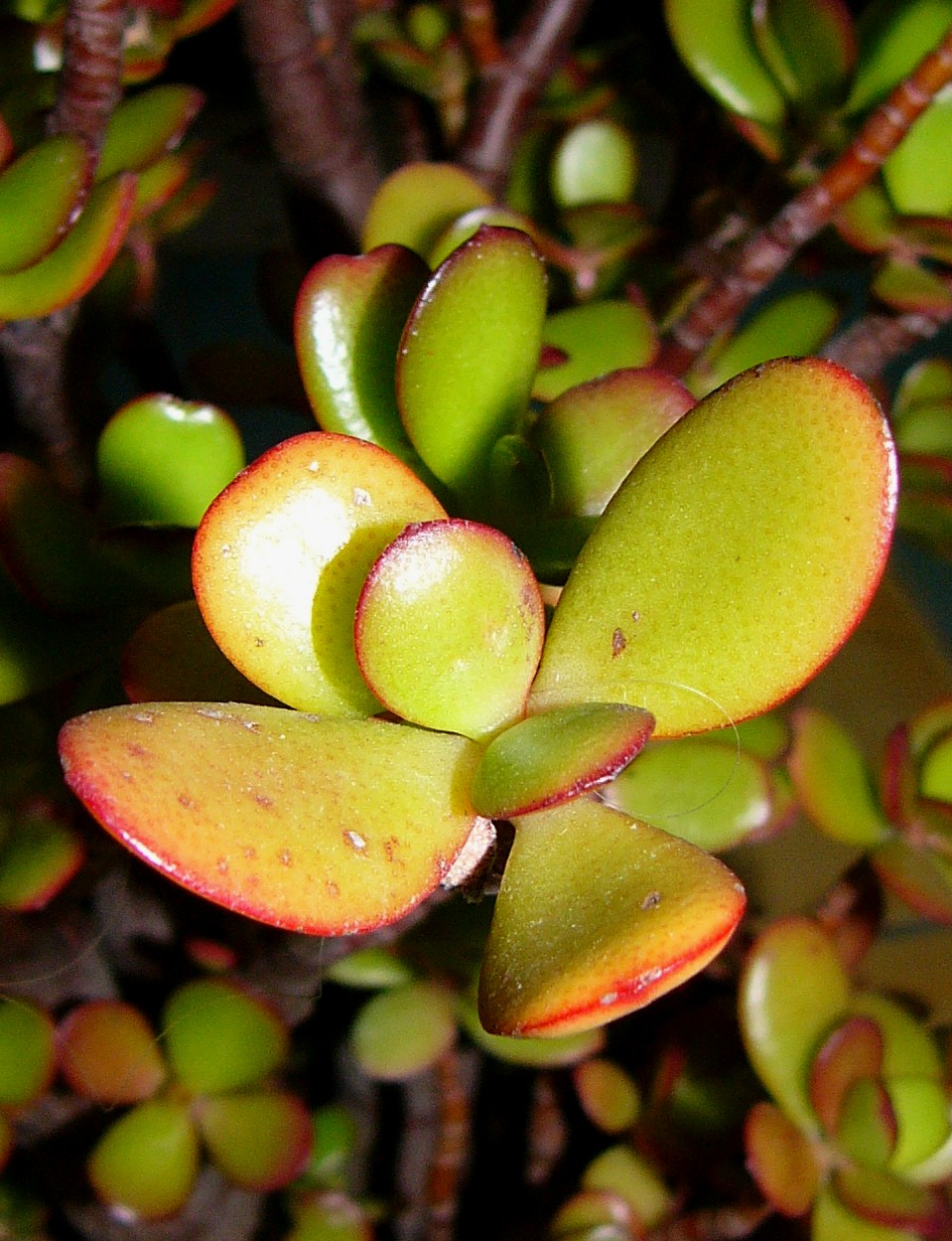 Triebe sukkulent, graugrün bis rötlich Blätter eispatelig, stumpf, 3 - 9 cm lang, 2 - 4 cm