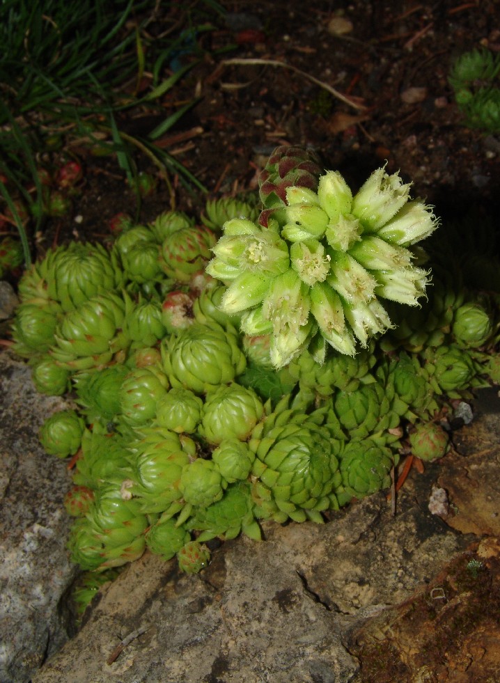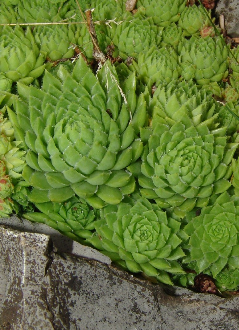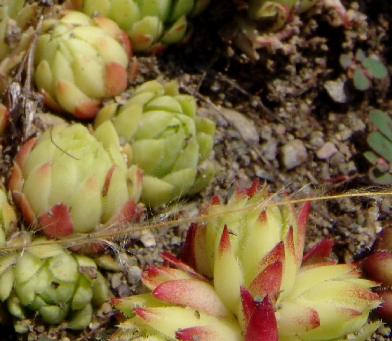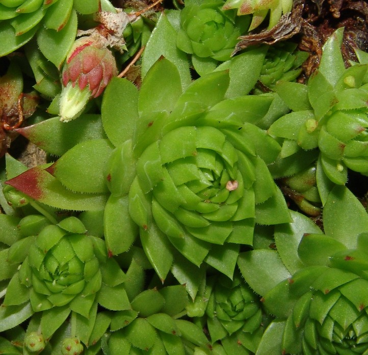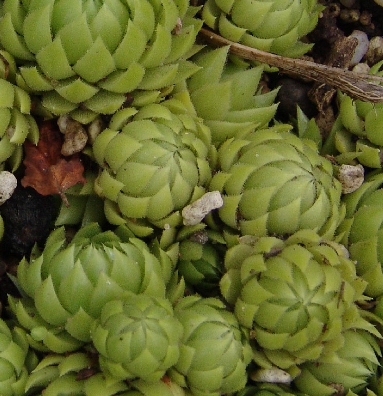 schmal eiförmig, 7 – 13 mm lang, Rosette 2 - 4 cm im Durchmesser kugelig, geschlossen, Rosettenblätter über der Mitte am breitesten, 6 – 10 mm breit, auf der Fläche kahl