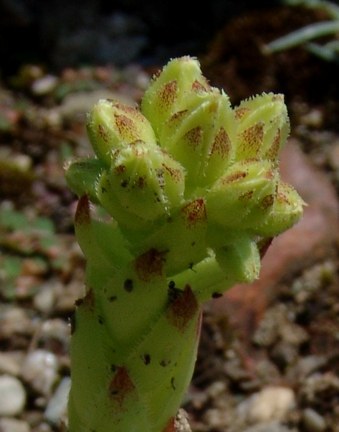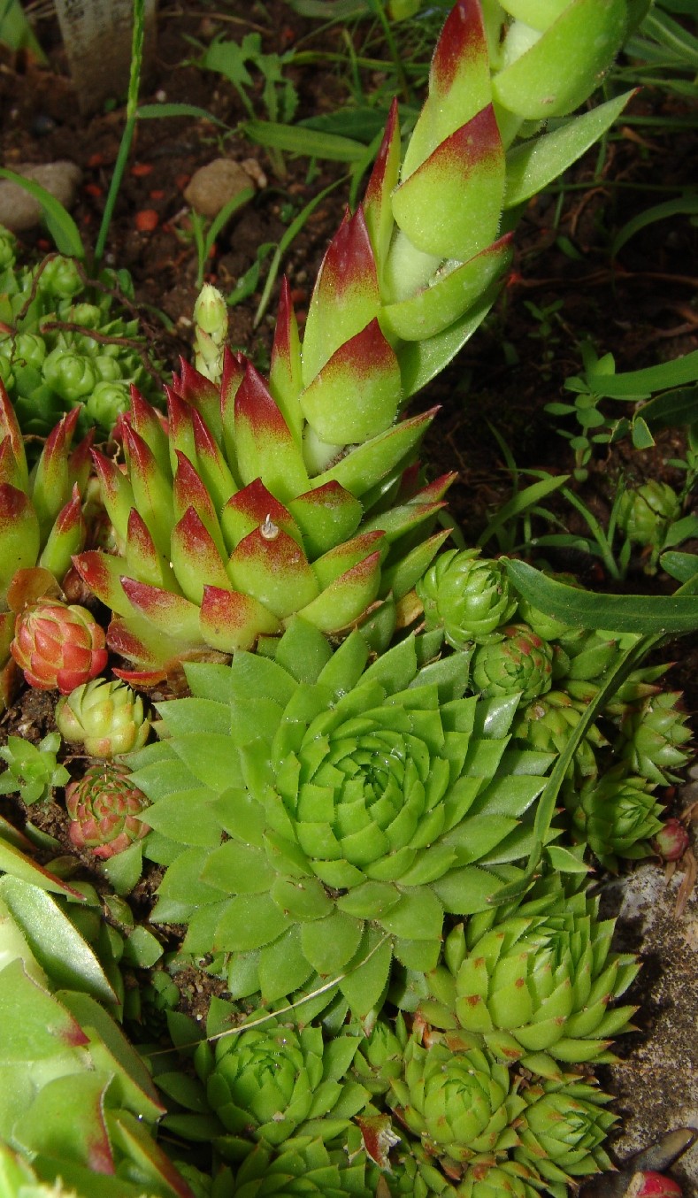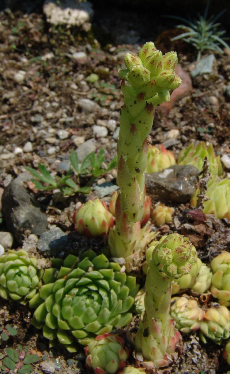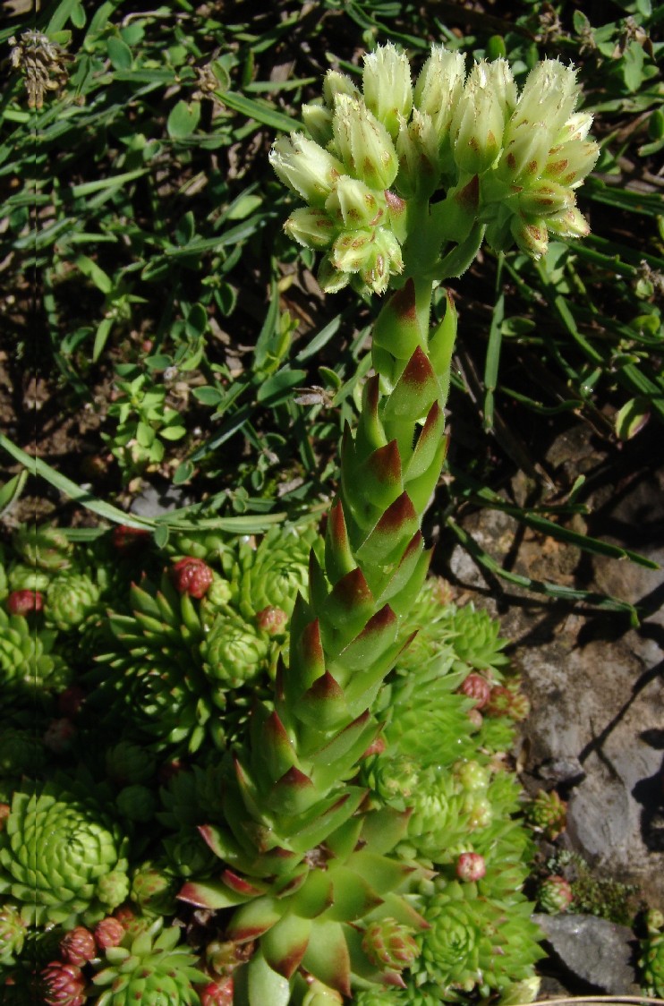 schmal eiförmig, 7 – 13 mm lang, Rosette 2 - 4 cm im Durchmesser kugelig, geschlossen, Rosettenblätter über der Mitte am breitesten, 6 – 10 mm breit, auf der Fläche kahl