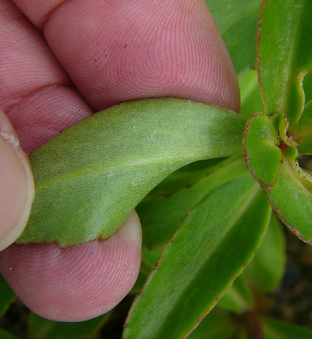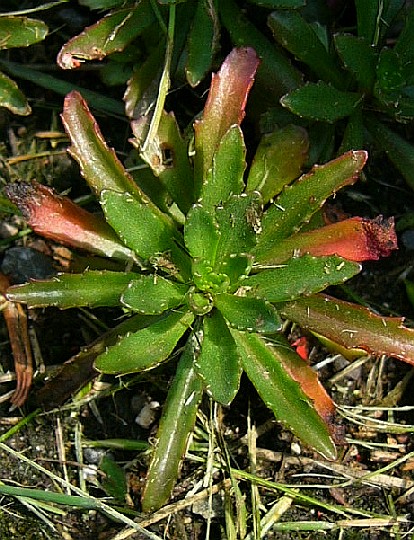 2 Blätter stumpf gezähnt, spatelförmig, +/- flach, 3 - 5 cm lang, 1 - 1,5 cm breit