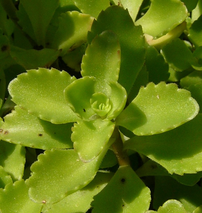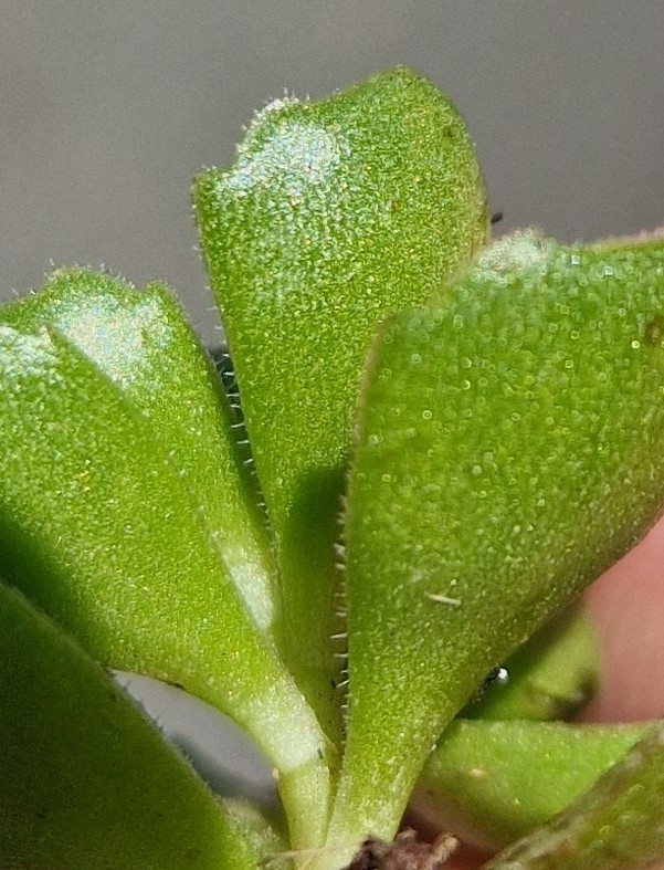 Blätter 12 - 20 mm lang, 6 - 8 mm breit, elliptisch, fleischig, flach, gegenständig, +/- gezähnt, in einen 5 - 10 mm langen Stiel verschmälert, nichtblühende Triebe bis 30 cm lang, rötlich, bilden an den Knoten Ausläufer