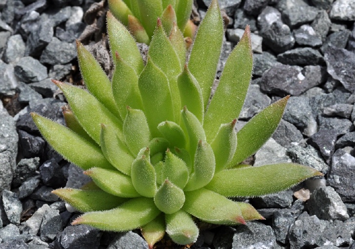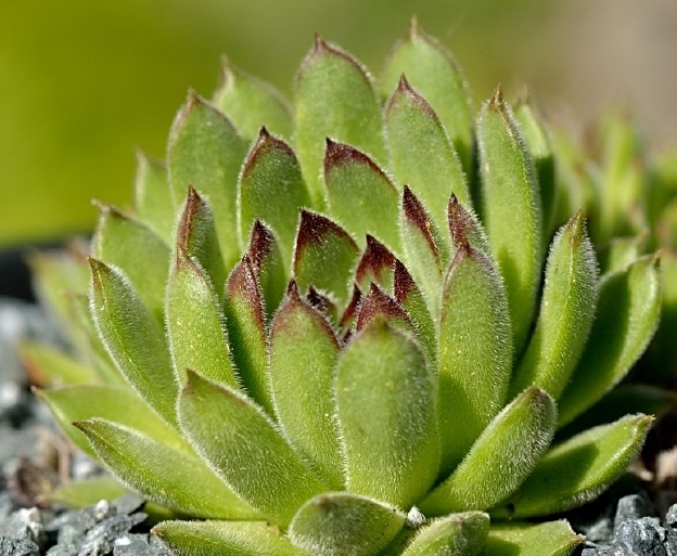 Rosettenblätter 15 - 40 mm lang, 7 - 15 mm breit, kurz zugespitzt, beiderseits dicht behaart, dunkelgrün mit roter Spitze, Haare am Rand ca. 2 mal so lang wie auf der Flächemit stechenden Spitzen auf beiden Seiten deutlich rot gefärbt, auf der Fläche kahl drüsenlos, randlich bewimpert, ohne spinnwebige Haaren
