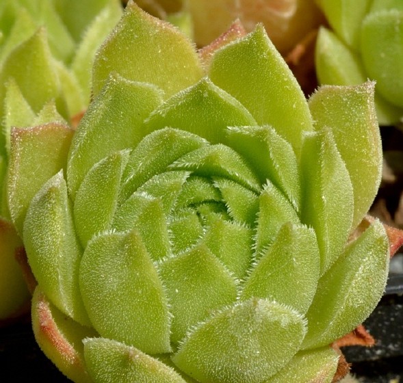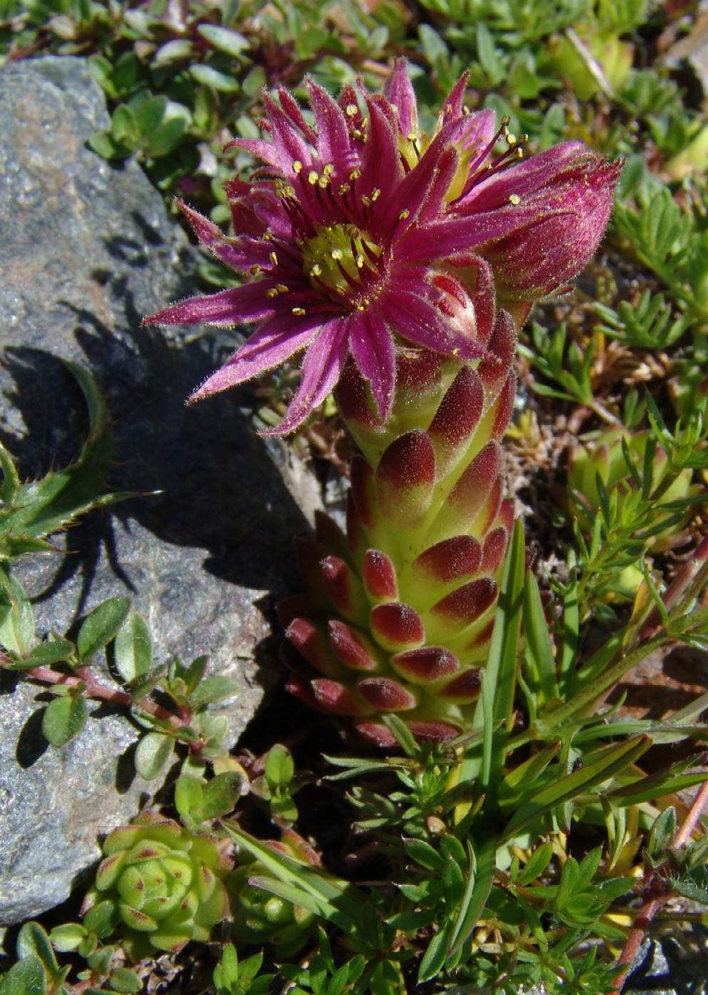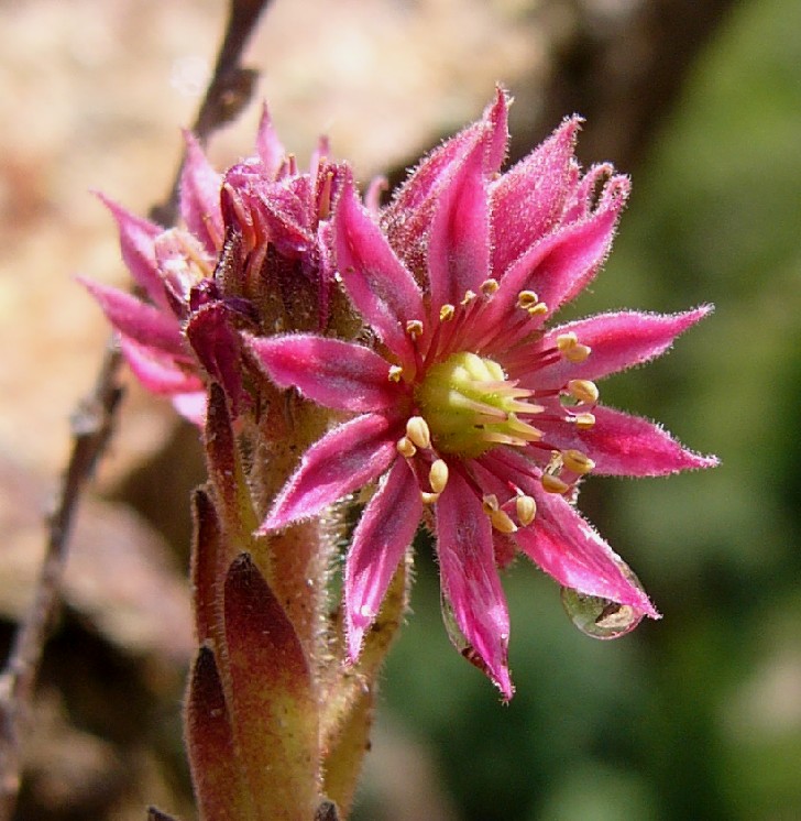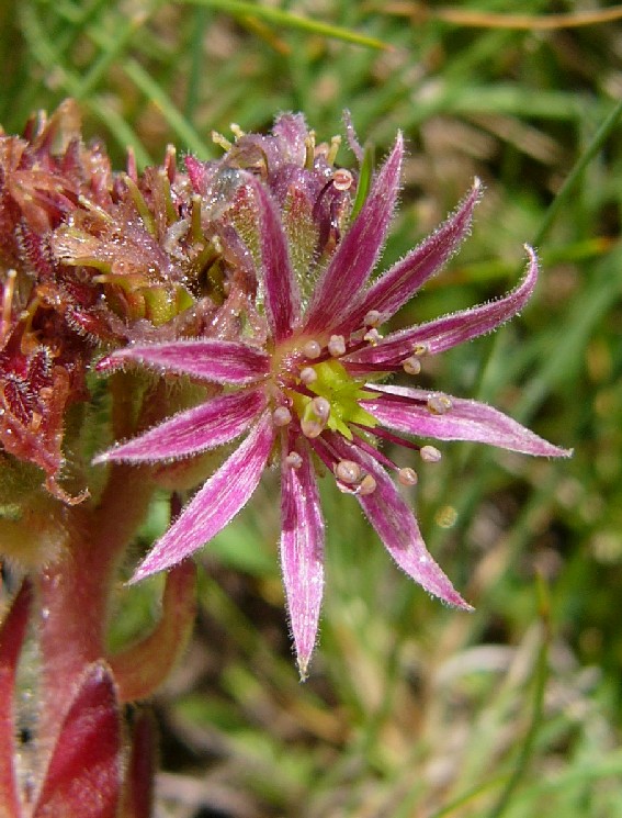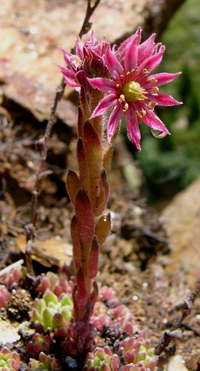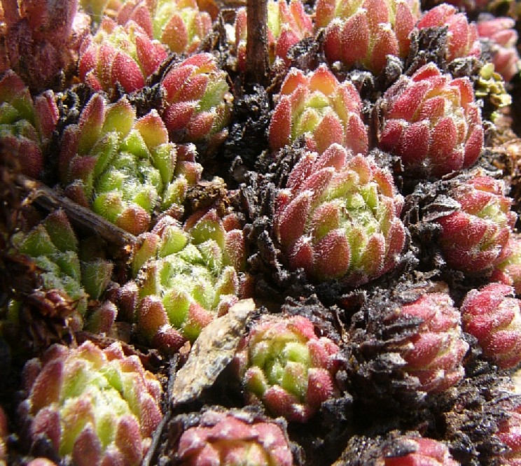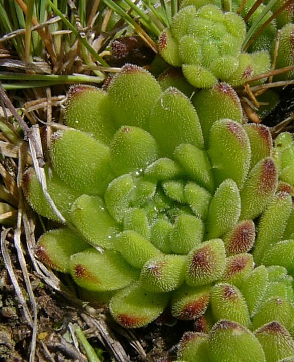 Sempervivum - Blüten rot, zumindest die jungen Rosettenblätter drüsig oder behaart, ohne spinnwebige Haare