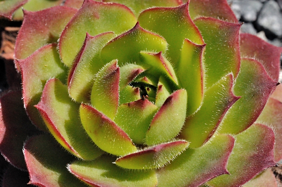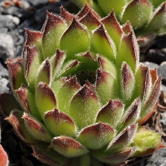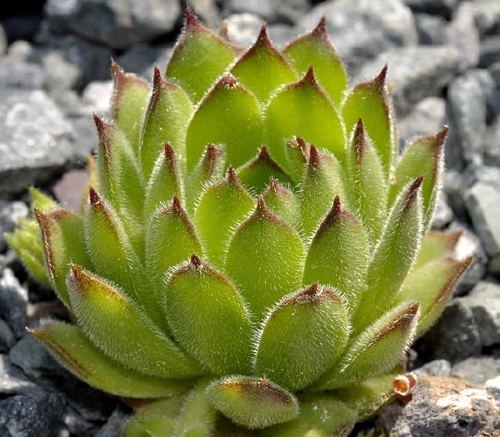 Rosetten 4 - 8 cm im Durchmesser, Rosettenblätter blaugrün, beiderseits kahl, randlich bewimpert, am Grund rotviolett, mit Stachelspitze