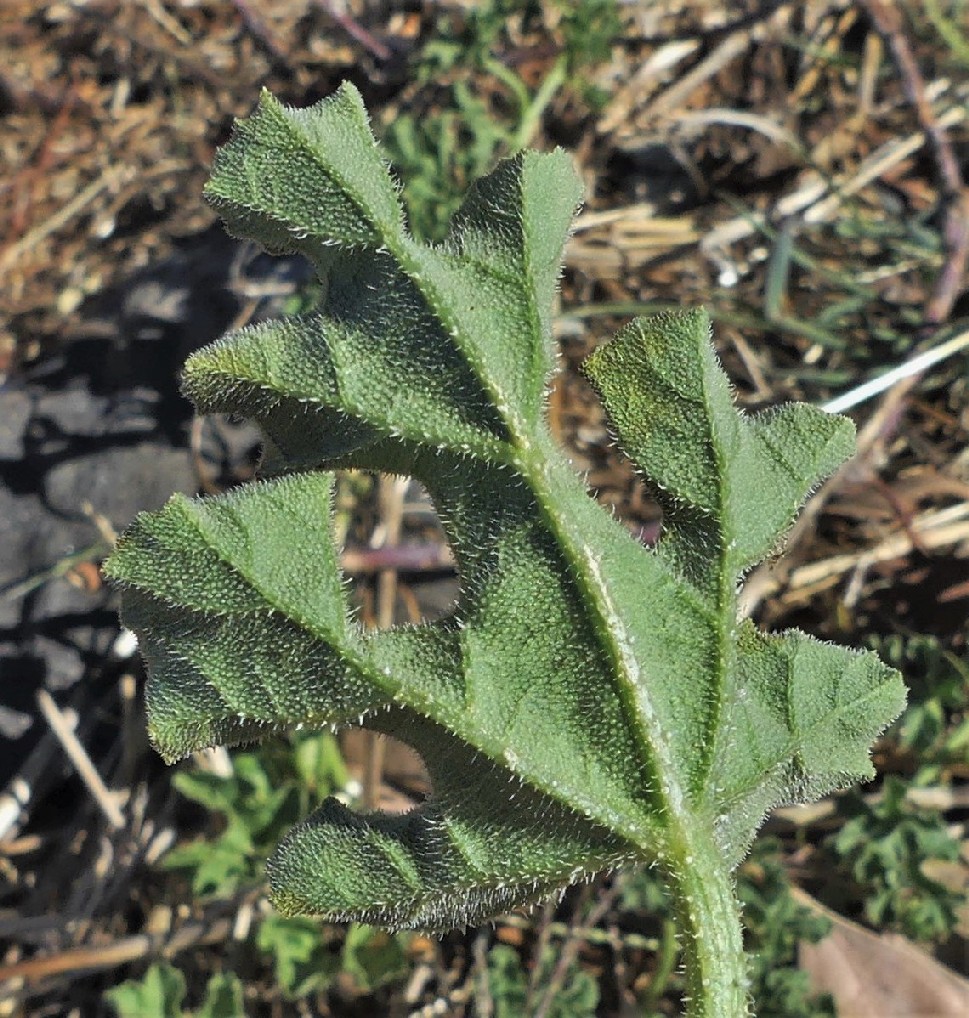 Blätter 5- eckig, 3 - 10 cm lang, 2 - 8 cm breit, tief fiederteilig, Blattlappen breit, 2 - 10 cm lang gestielt, Blattstiel und Blätter beiderseits rau behaart