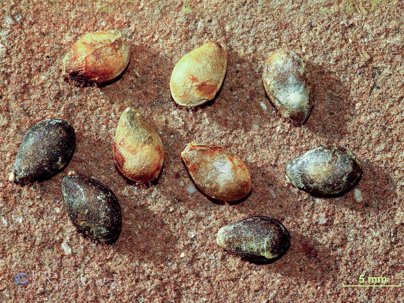 Samen eiförmig abgeflacht, 5 - 6 mm lang, auf der Fläche granuliert