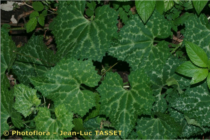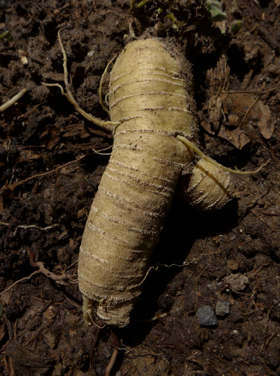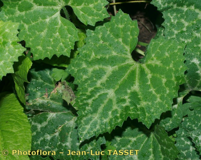 Blätter handförmig geteilt, oberseits weiß marmoriert, Wurzel rübenartig verdickt