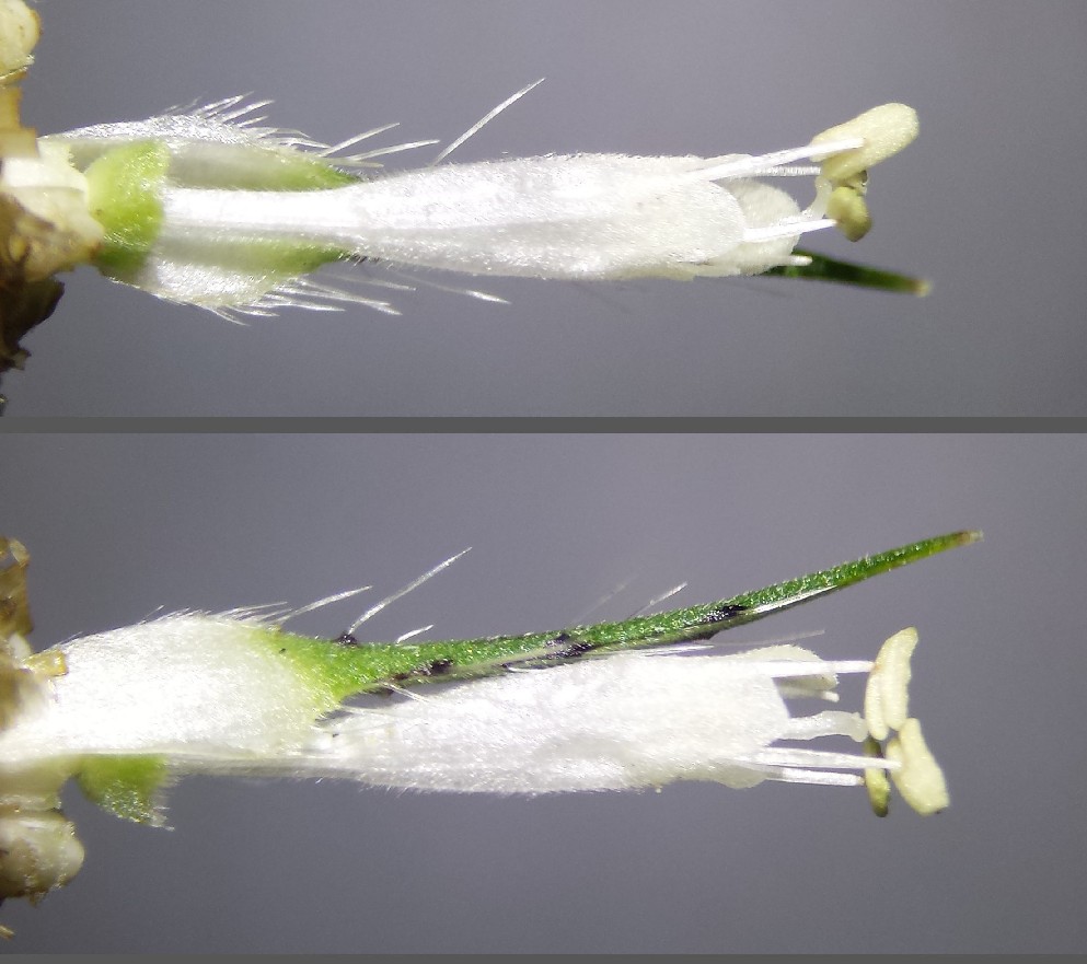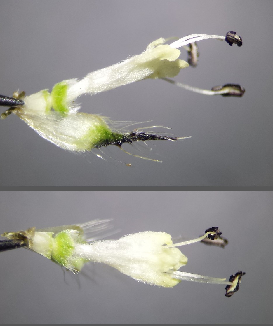 Blüten weiß oder cremefarben, behaart, mit langer Kronröhreund 4 ungleichmäßigen Kronzipfeln, 4 Staubblätter Staubbeutel dunkelviolett