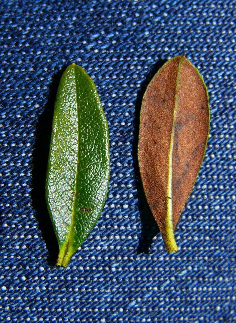 Blätter elliptisch, 20 mm lang, 12 mm breit, immergrün, ledrig,