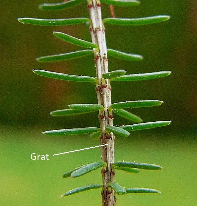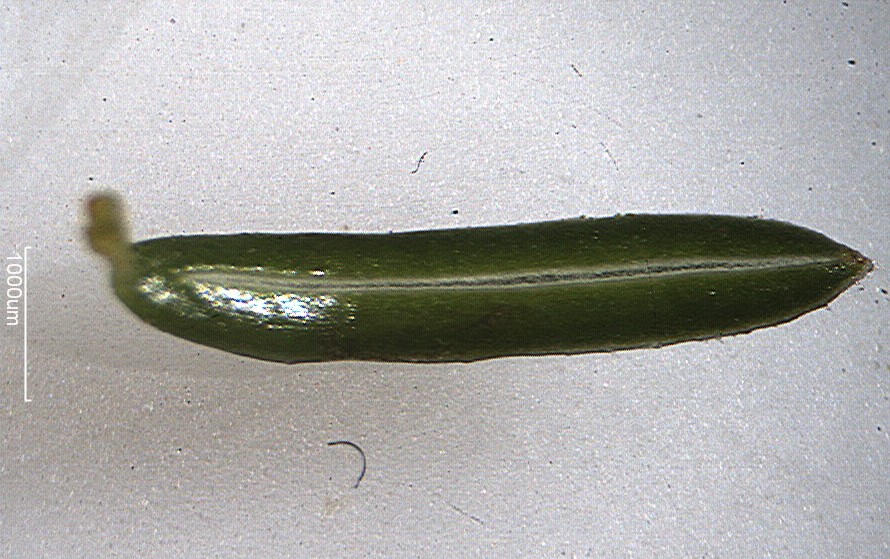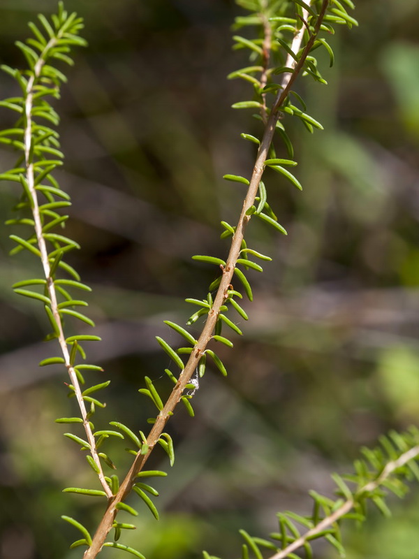 glänzend, Stängel kahl, Blätter nadelförmig, 5 - 8 mm lang, 0,5 mm breit, unterseits mit weißem Streifen