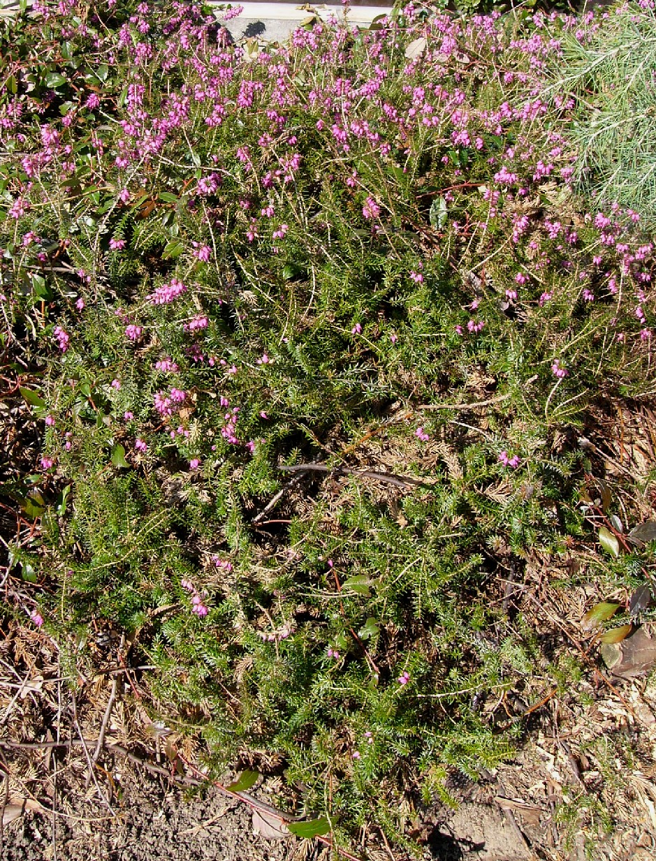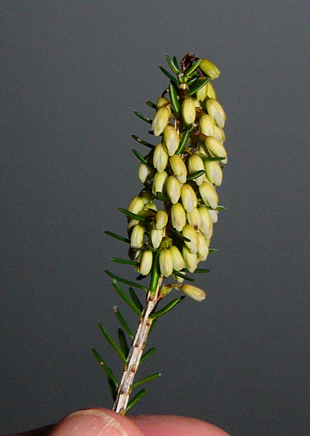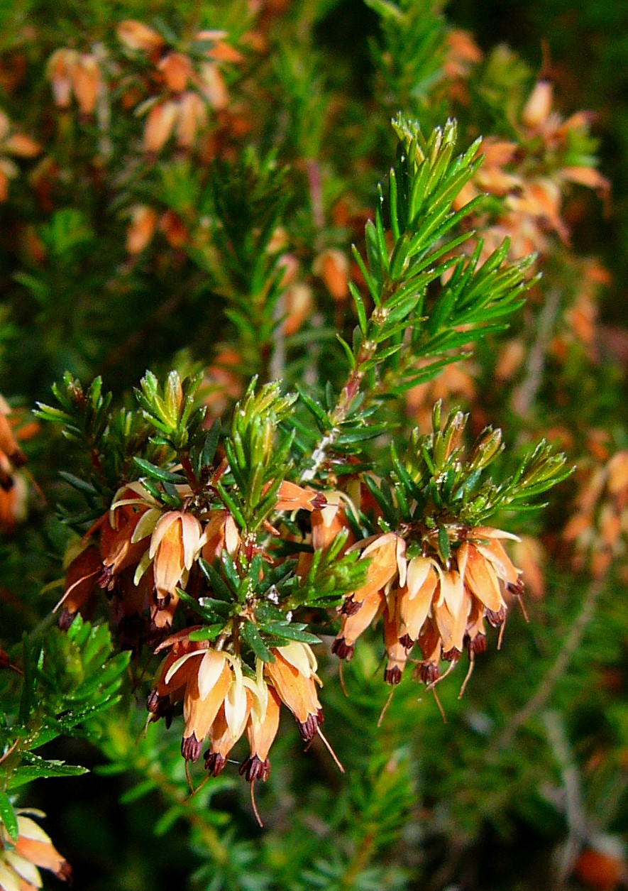 Erica - Blüten rosa, Staubbeutel ragen aus der Krone, Blütenstiel so lang wie die Kelchblätter