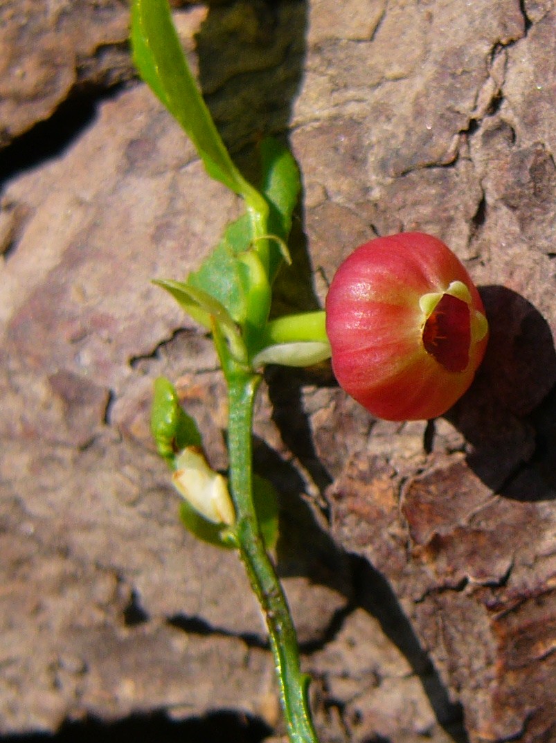 Blüten rötlich, rundlich, meist einzeln in den Achseln von Laubblättern
