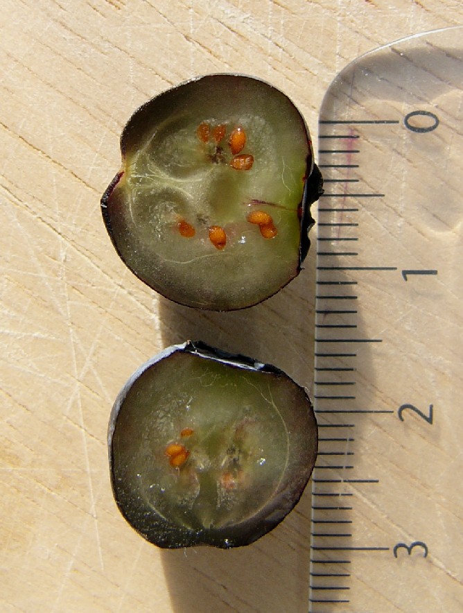 Beeren +/- kugelig, 7 - 10 mm im Durchmesser, blauschwarz, essbar