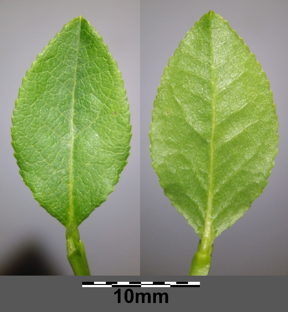 Blätter 2 - 3 cm lang, krautig, spitz, fein gesägt, hellgrün, beiderseits kahl