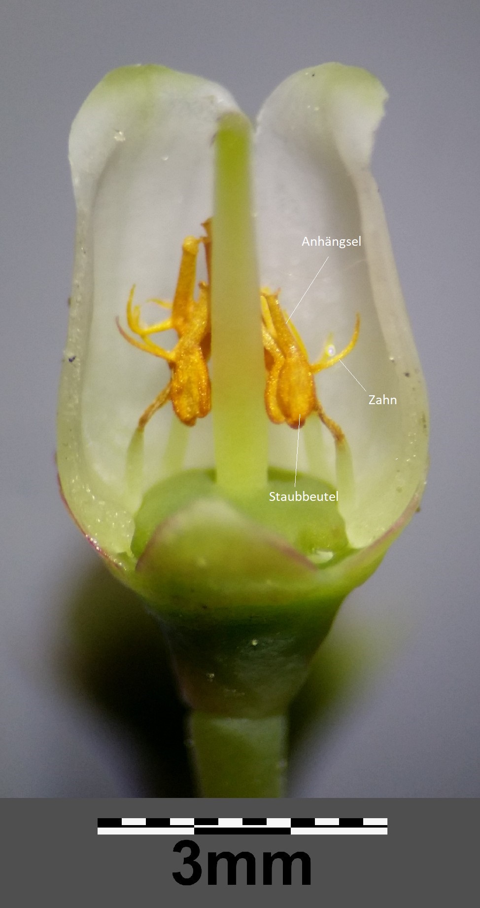 Blüten mit 8 - 10 Staubblättern, Staubbeutel mit seitlichem "Zahn" und röhrenförmigem Anhängsel, Griffel kürzer oder wenig länger als die Krone, Griffel 3 - 4 mm lang