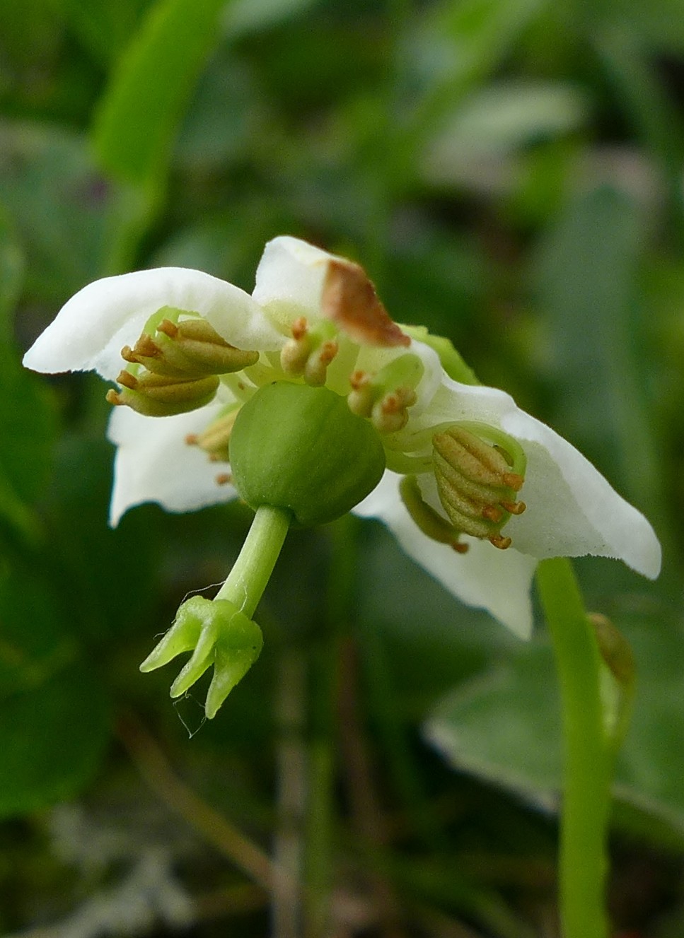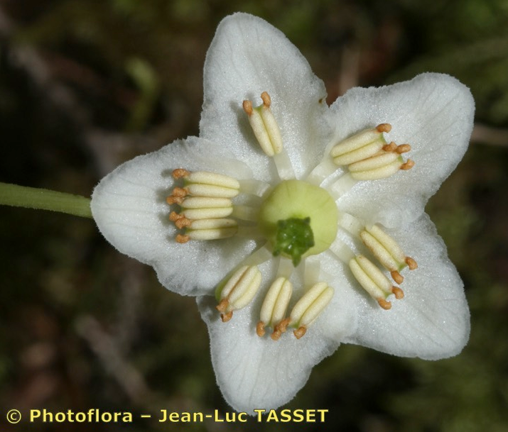 Blüten 15 - 20 mm im Durchmesser, mit 5 weißen, flach ausgebreitete, oft zerknitterten Kronblättern, 10 ca. 3 mm lange, Staubblätter, Antheren hellgelb, mit dunklerem Anhängsel an der Spitze
