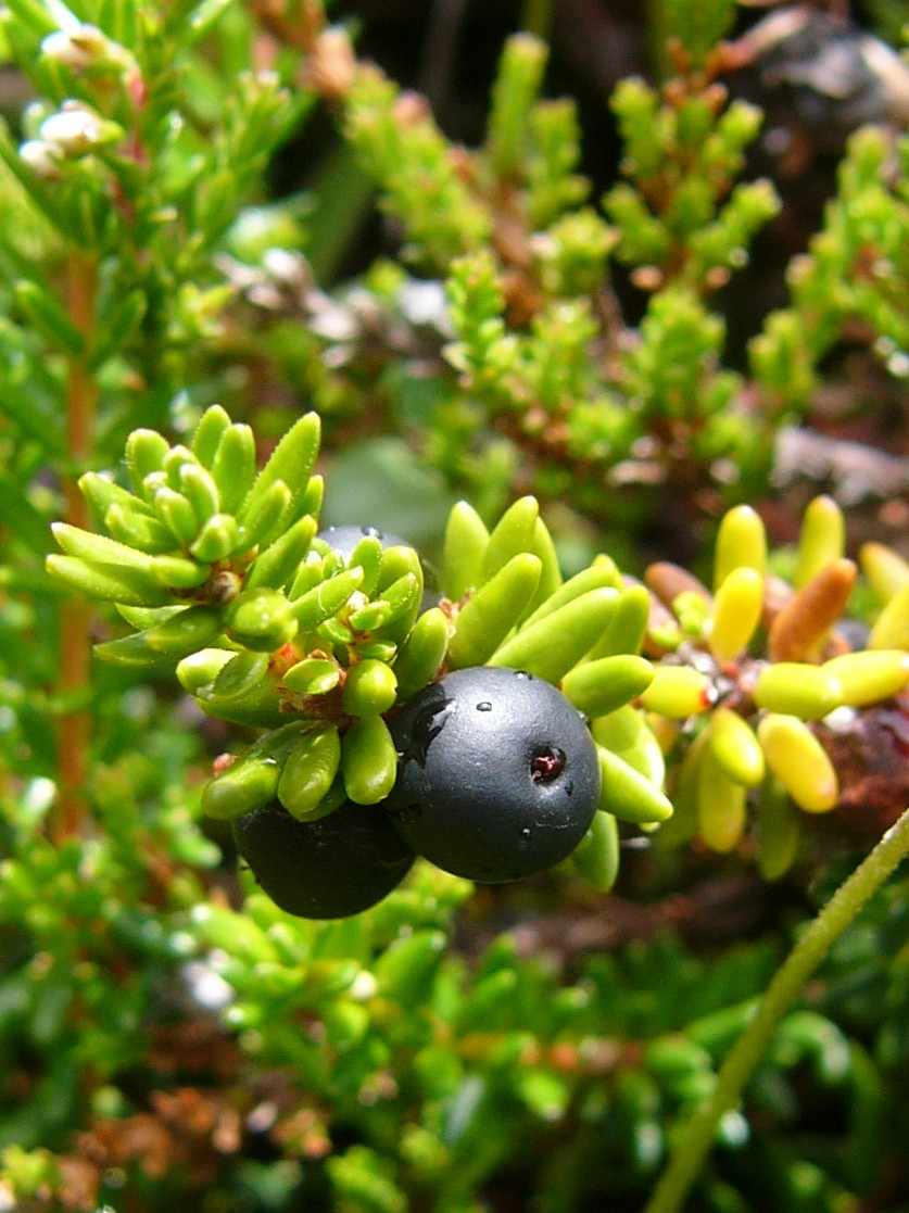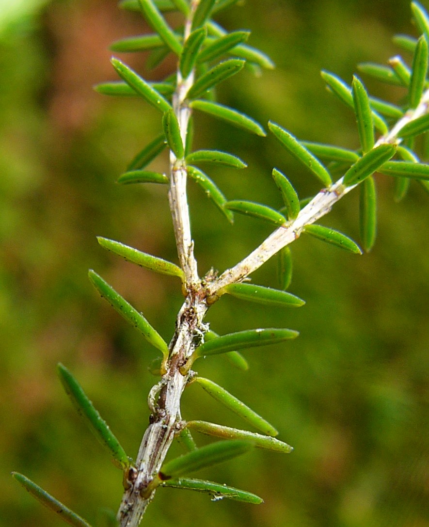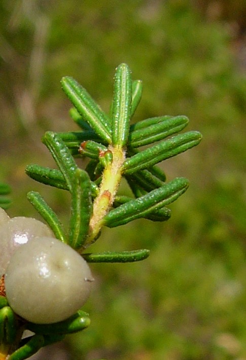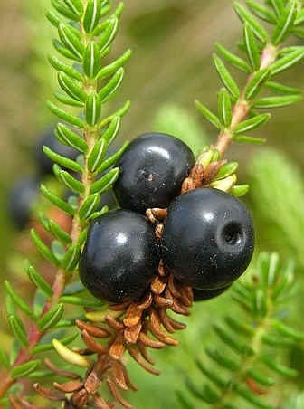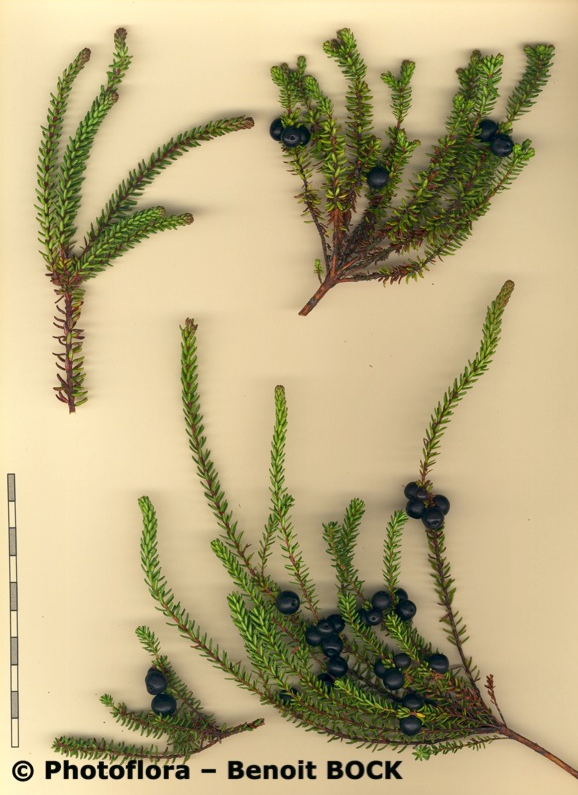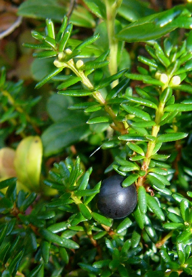 Pflanze reich fruchtend, Reife Beeren schwarz Blätter sparrig abstehend, nadelförmig Blätter unterseits mit weißer Rinne