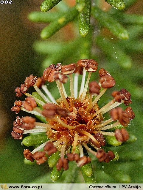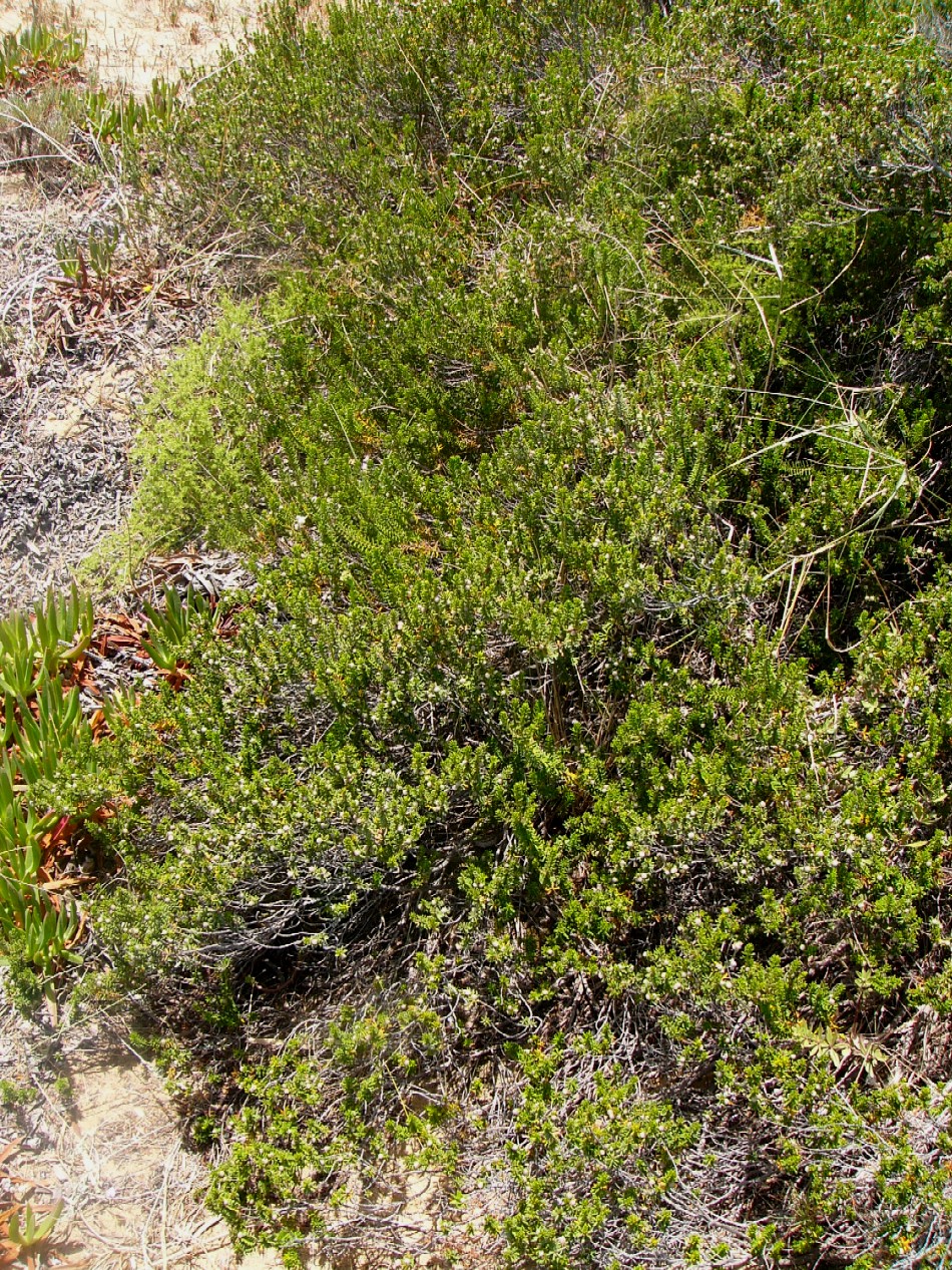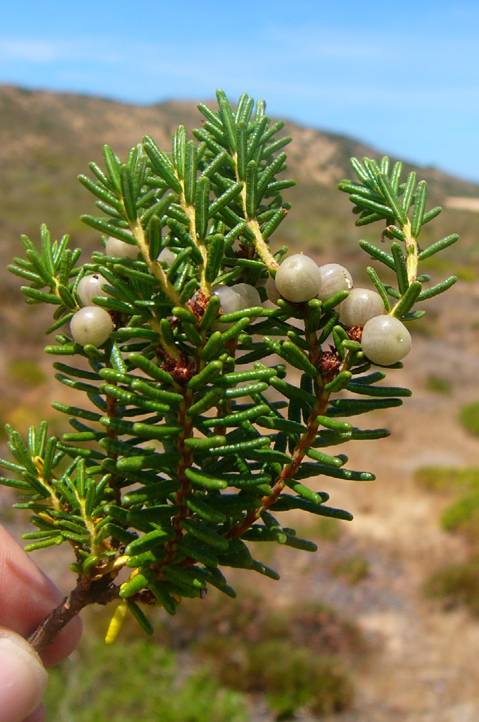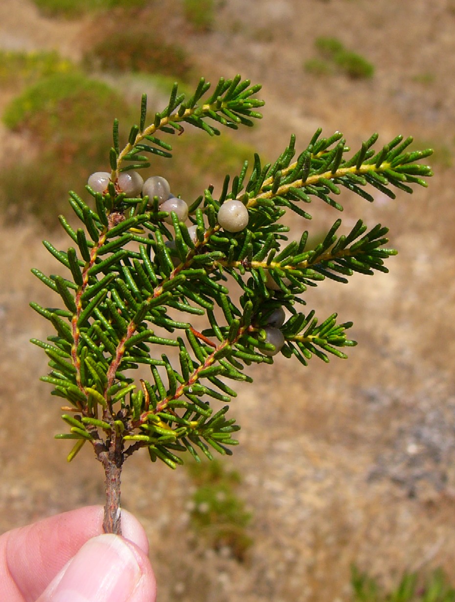 Pflanze reich fruchtend, Reife Beeren schwarz Blätter sparrig abstehend, nadelförmig Blätter unterseits mit weißer Rinne