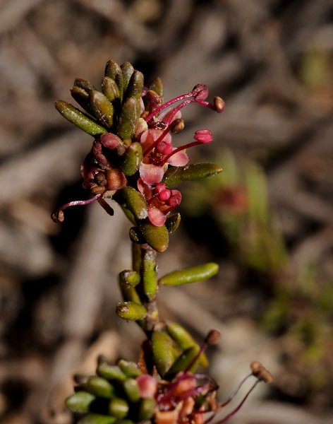 Früchte = vierfächerige Kapseln, in die vertrocknete Krone eingeschlossen Blüten rosa, weiß oder hellgrün, 2 - 5 mm lang, mit 4 Kronzipfeln > 3 |