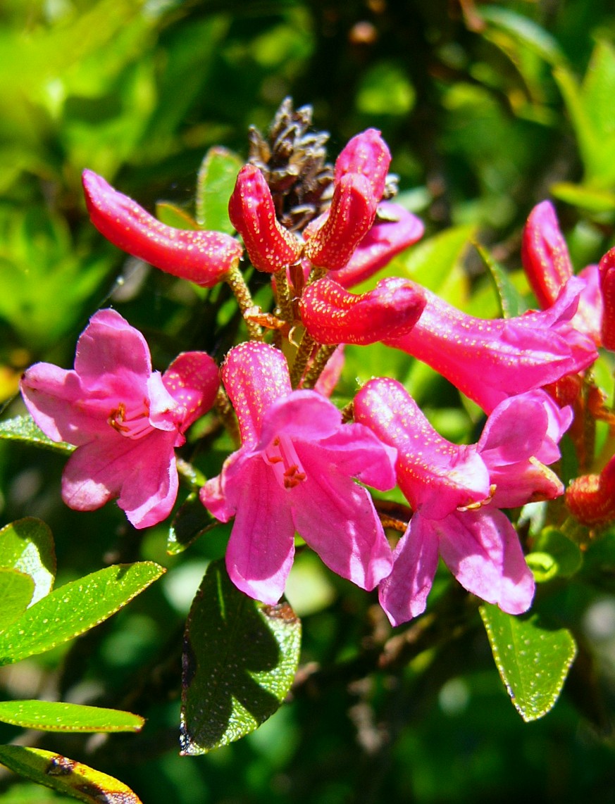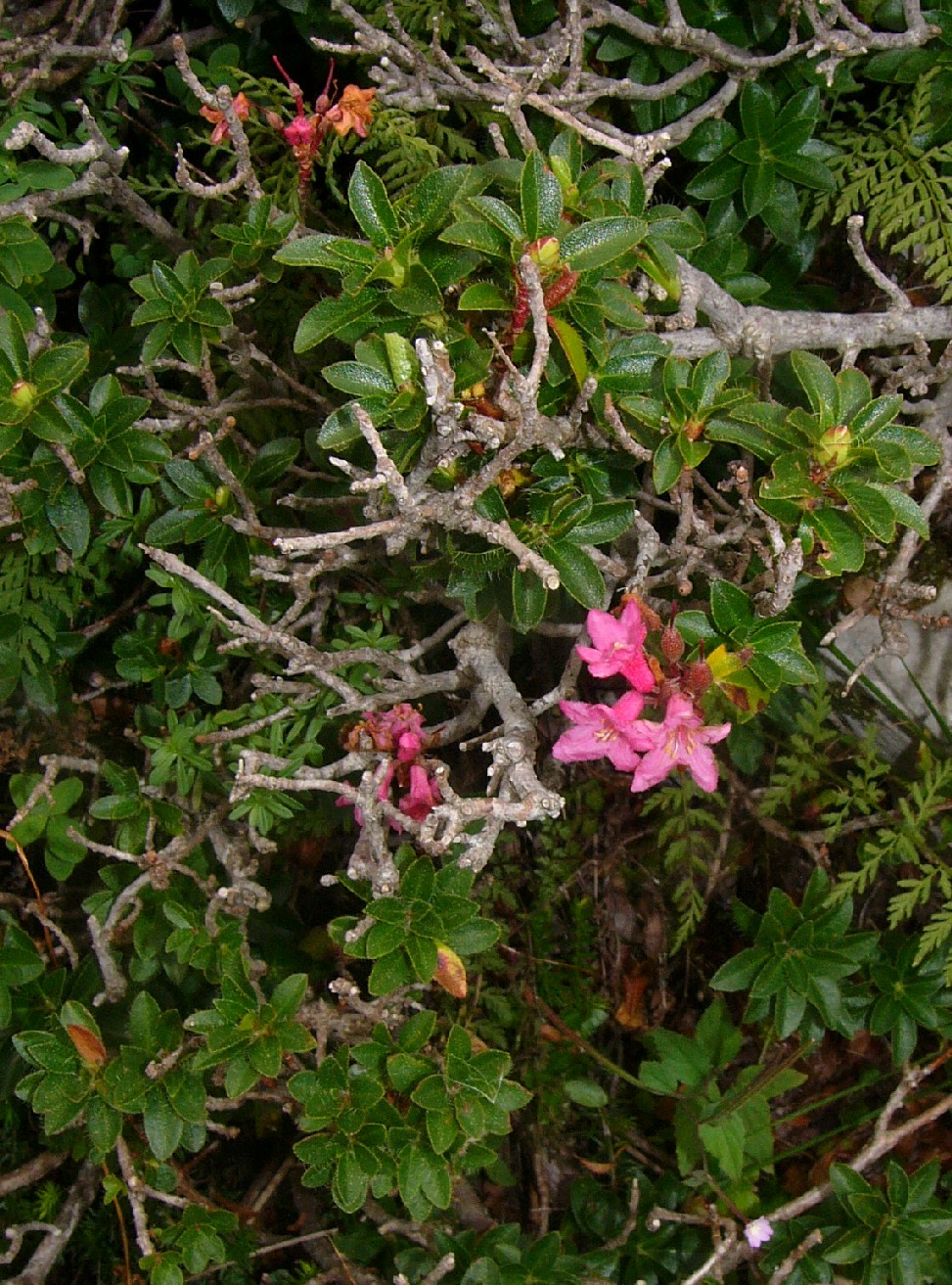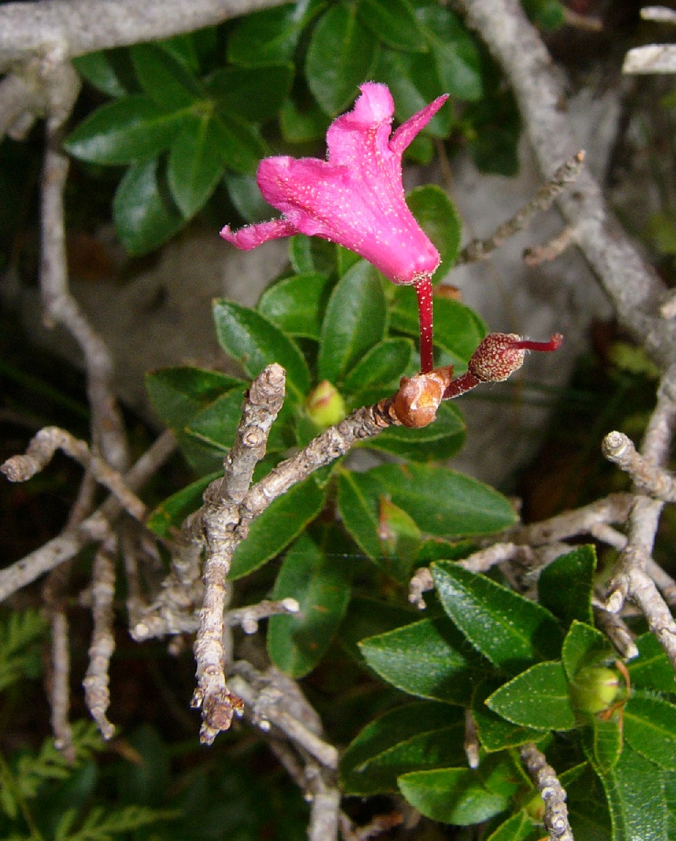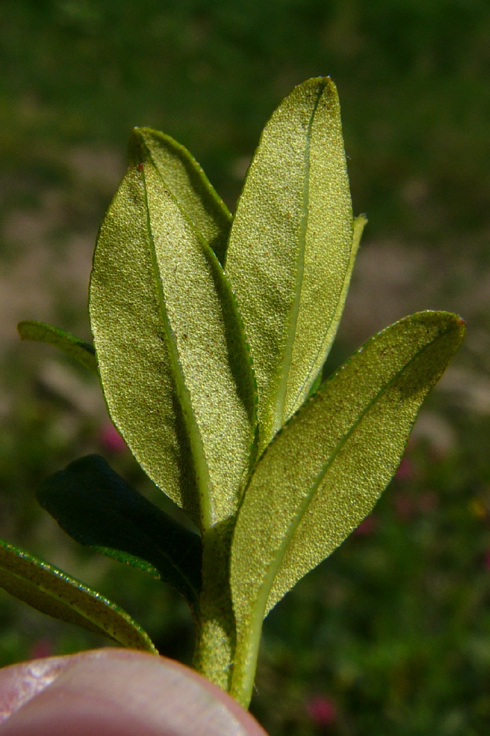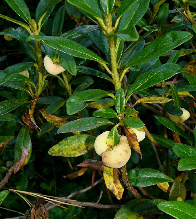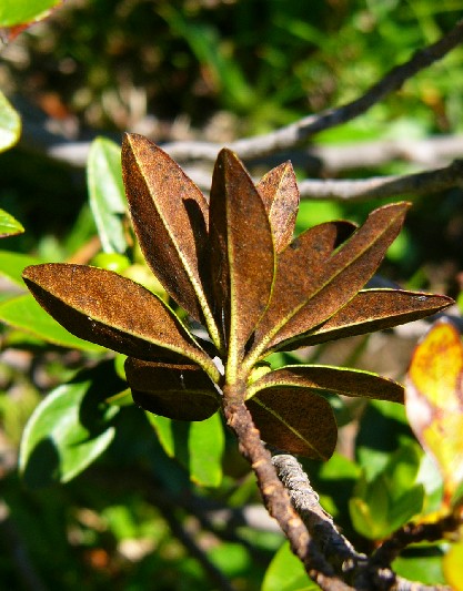 Blätter lanzettlich, 10 - 40 mm lang, 10 mm breit, oberseits dunkelgrün glänzend, ganzrandig, am Rand +/- umgerollt, ohne Wimpern, Blattunterseite bei älteren Blättern durch Schülferschuppen rostbraun (Name!)