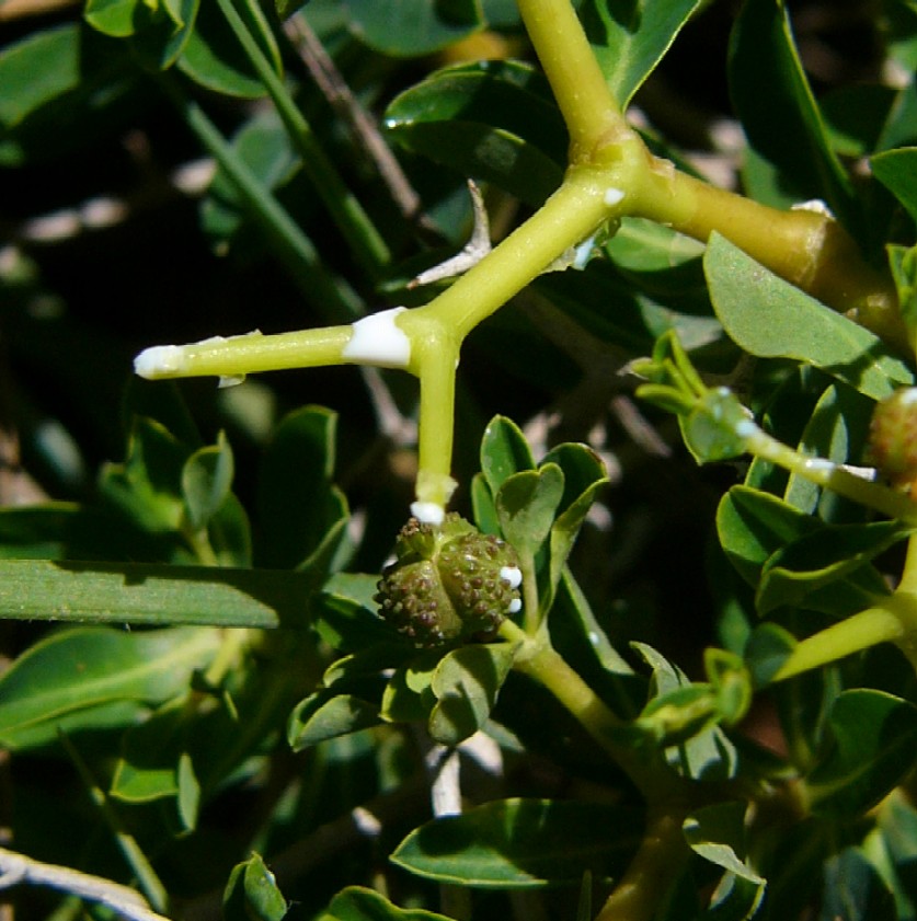 Scheinblüten mit 5 ovalen Drüsenanhängseln Kapsel mit kurzen kegelförmigen Warzen Stängelblätter 5 - 12 mm lang, 3 - 5 mm breit, blaugrün, den Hochblättern ähnlich