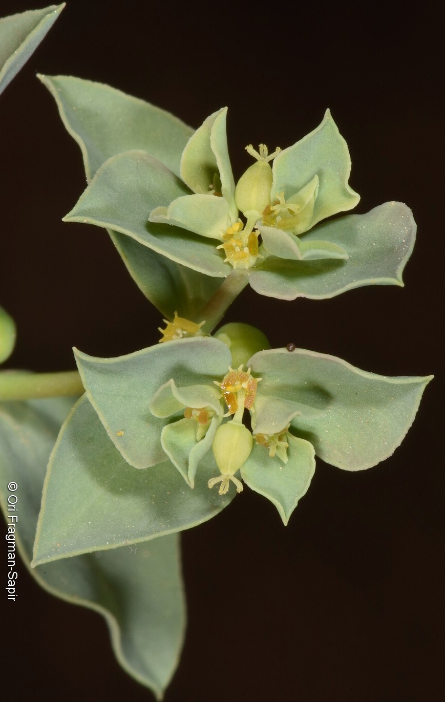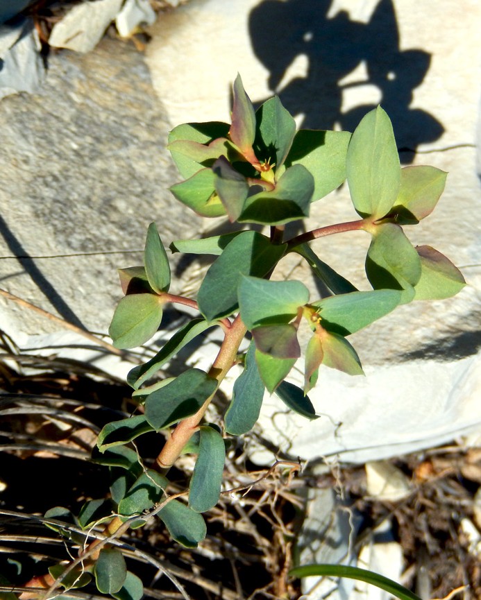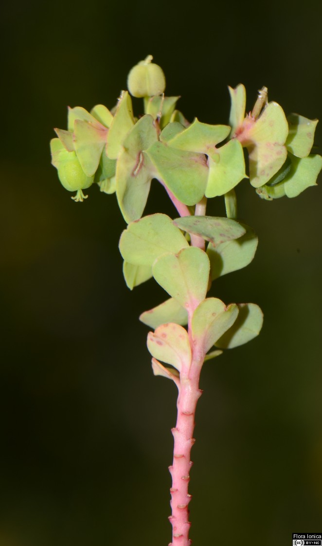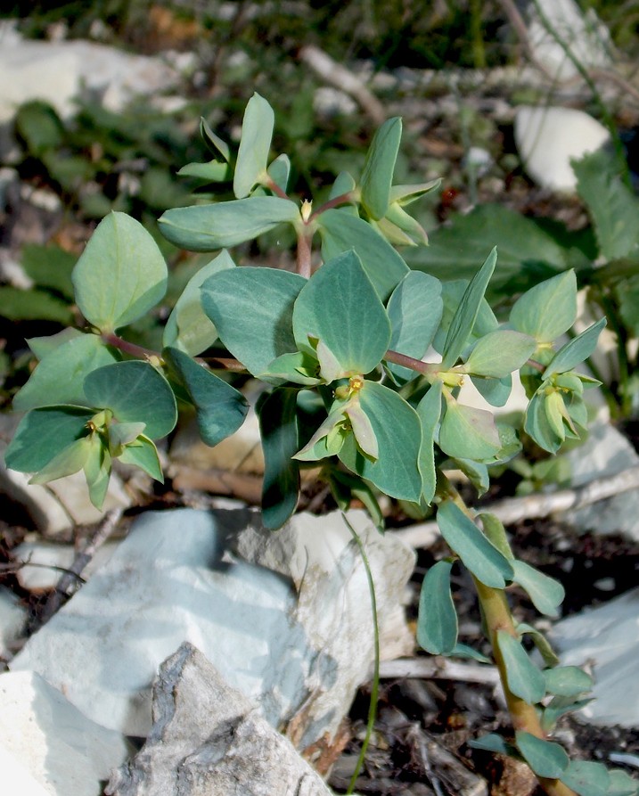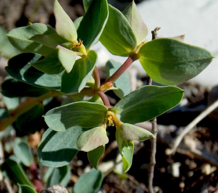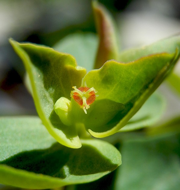 Euphorbia - Pflanze krautig, aufrecht, Stängelblätter eiförmig oder eilanzettlich, am Grund keilig, kurz gestielt, 5 - 25 mm breit, Drüsenanhänge halbmondförmig oder mit Hörnchen, Hüllchenblätter getrennt