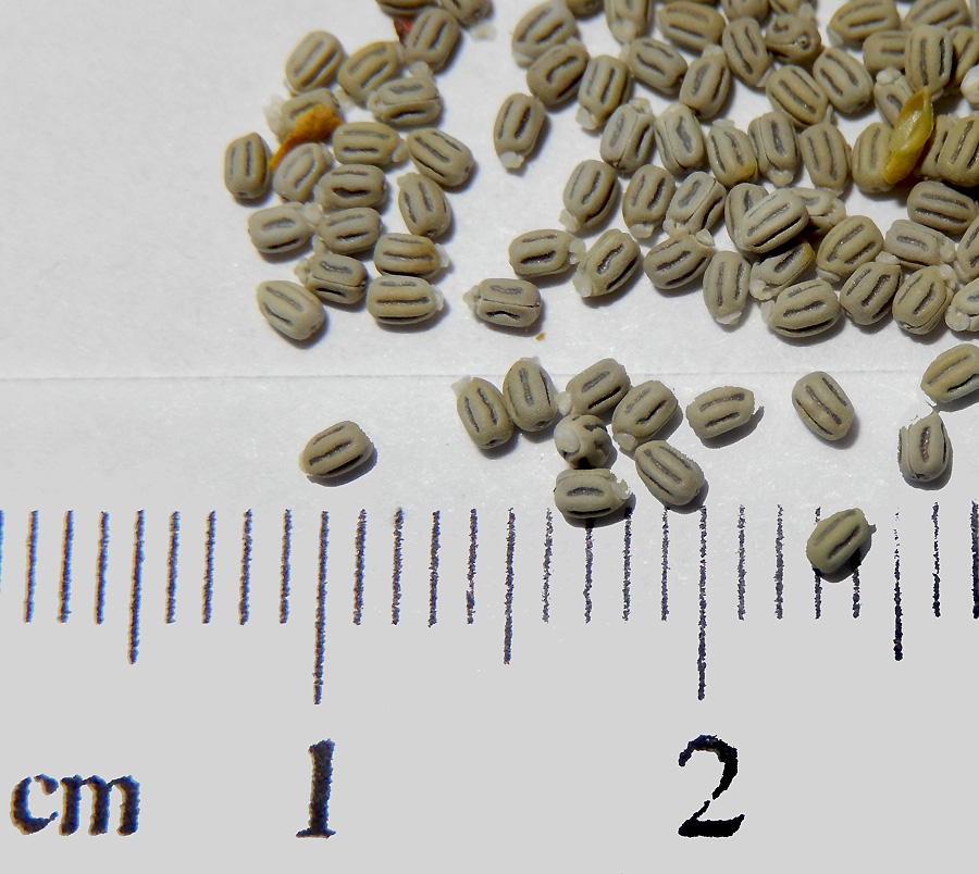 Samen elliptisch, grau, ca. 2 mm lang, mit 6 deutlichen Längsfurchen,