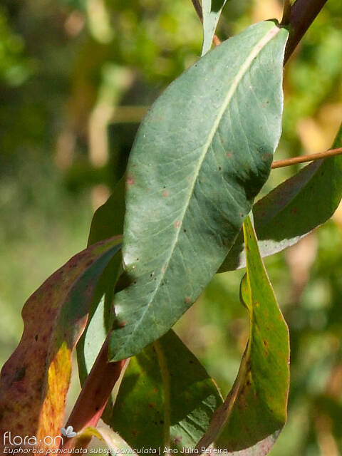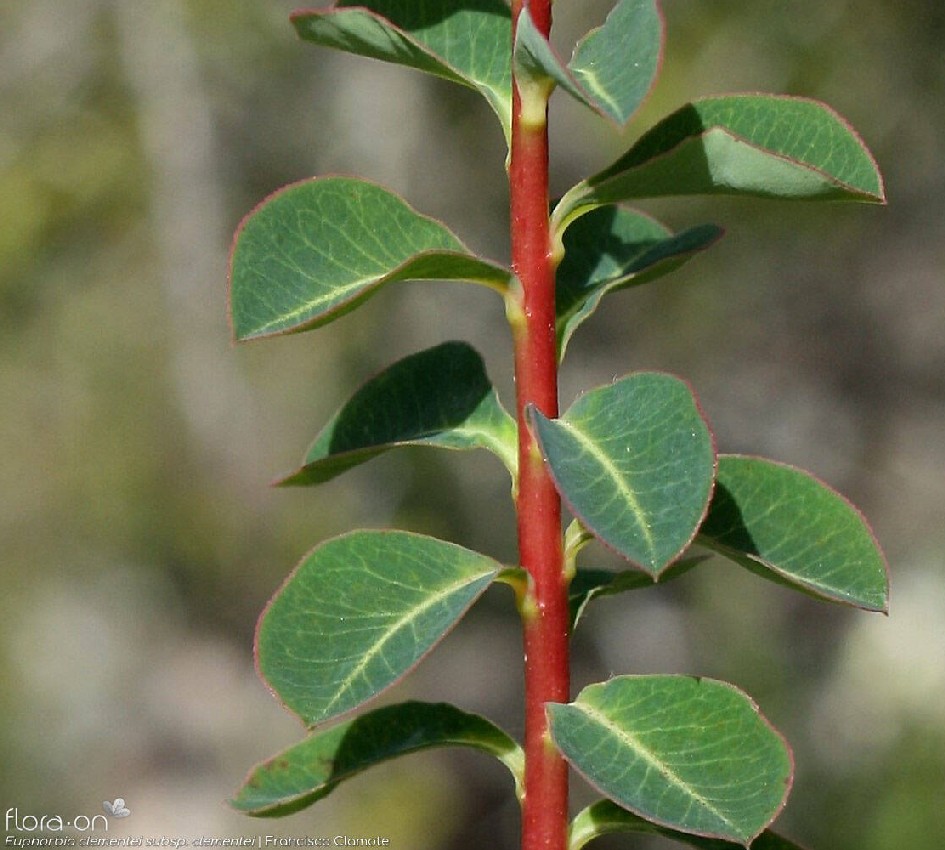 Stängel kahl, oft rot Blätter 15 - 40 mm lang, 7 - 15 mm breit, elliptisch, sitzend, ganzrandig oder schwach gesägt, stumpf, kahl oder behaart, hellgrün, bald rot werdend