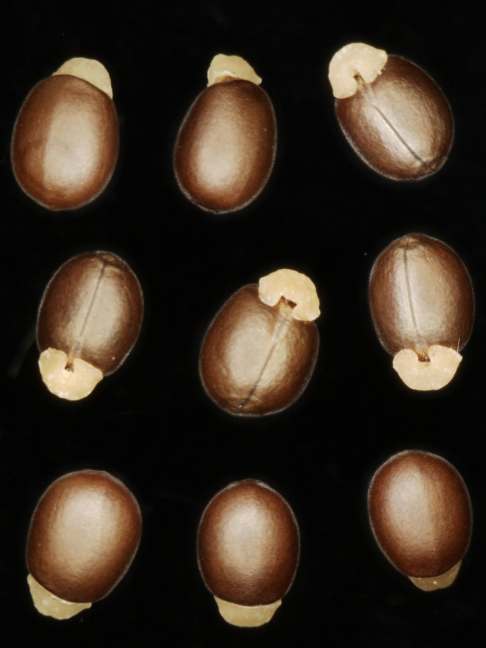 Samen elliptisch, 2,7 - 3,7 mm lang, 2,2 - 3 mm breit, glatt oder papillös, braum glänzend mit deutlicher Rückenlinie, Anhängsel kegelförmig 0,5 - 1 mm hoch, 1 mm breit, seitlich
