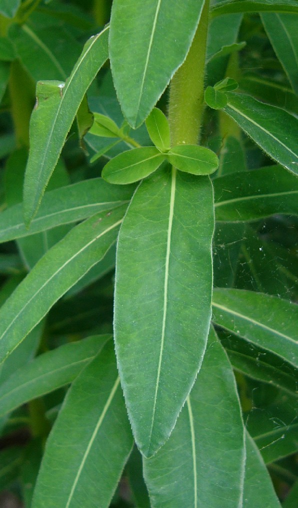 Enddolde zuletzt überragend Frucht nur mit vereinzelten Haaren Stängel oben kahl, Blätter 4 - 8 cm lang, 1 - 2 cm breit, vorne spitz > 3