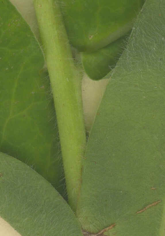 Stängelblätter 40 - 80 mm lang, 15 - 45 mm breit, sitzend, ganzrandig, vorne stumpf oder ausgerandet, oberseits kahl, unterseits behaart