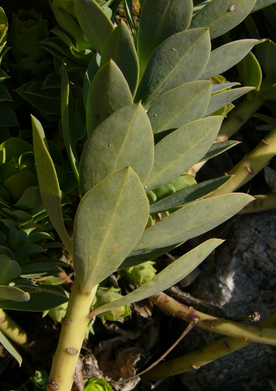 Blätter eilanzettlich, blaugrün, fleischig, spitz
