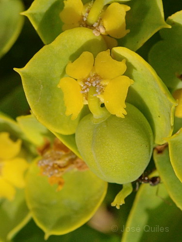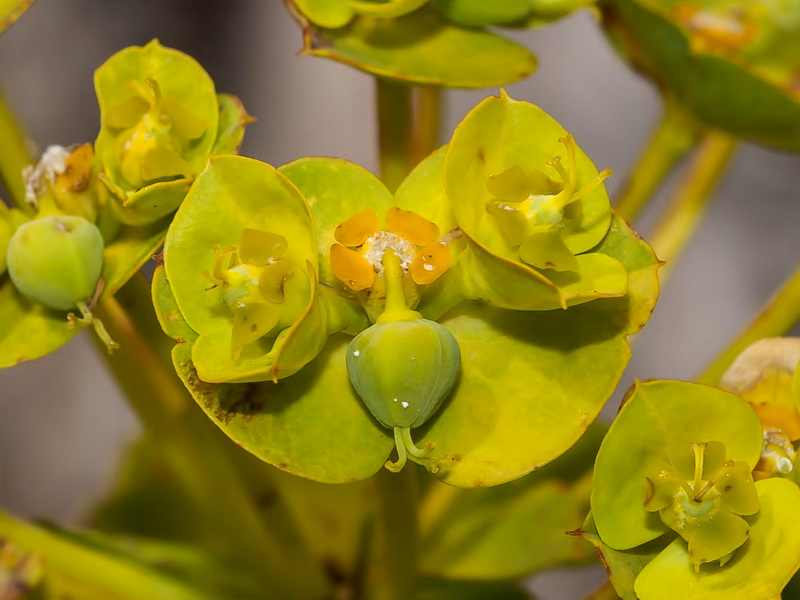 Kapsel glatt oder fein punktiert, je nach Unterart kahl oder behaart, 3,7 - 4,4 mm lang, Drüsen mit kurzen Hörnchen, Cyathienrand meist behaart, Tragblätter der Cyathie breiter als lang, kurz zugespitzt Samen ca. 2,6 mm lang, 1,7 mm breit, glatt, gelb,
