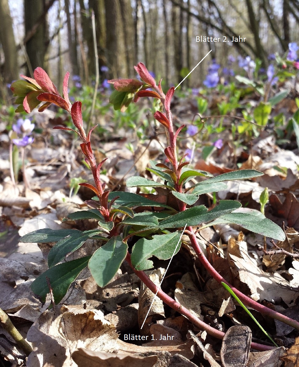 Kein Vorkommen in Sardinien und Korsika Cyathie 1,9 - 3,1 mm lang, 1,6 - 2,5 mm breit, Samen 2,1 mm - 2,6 mm lang Blätter des 1. Jahres unterhalb der neuen Blätter rosettig gehäuft, größer als die des 2. Jahres > Blätter verschieden groß, in der Mitte gehäuft